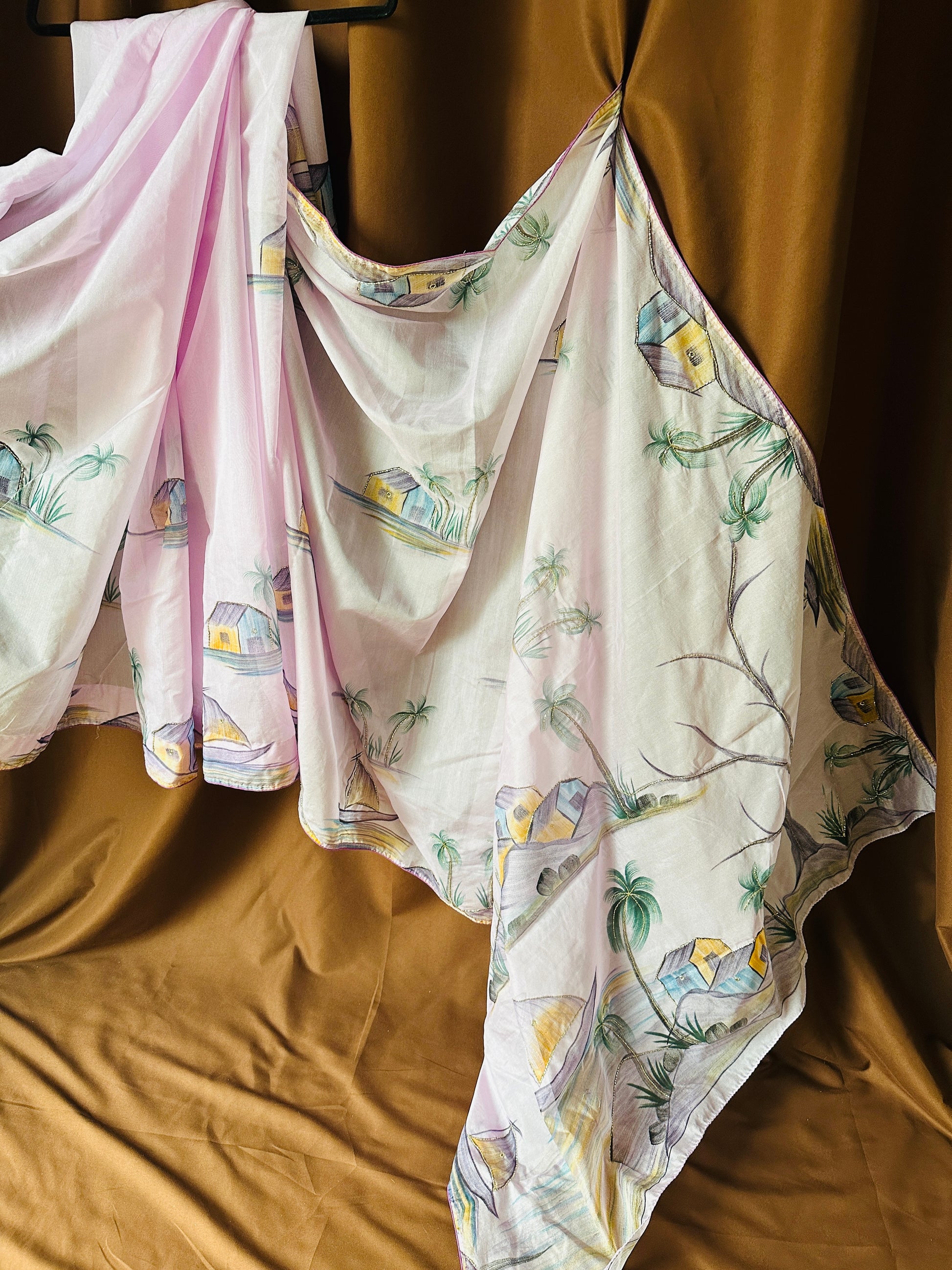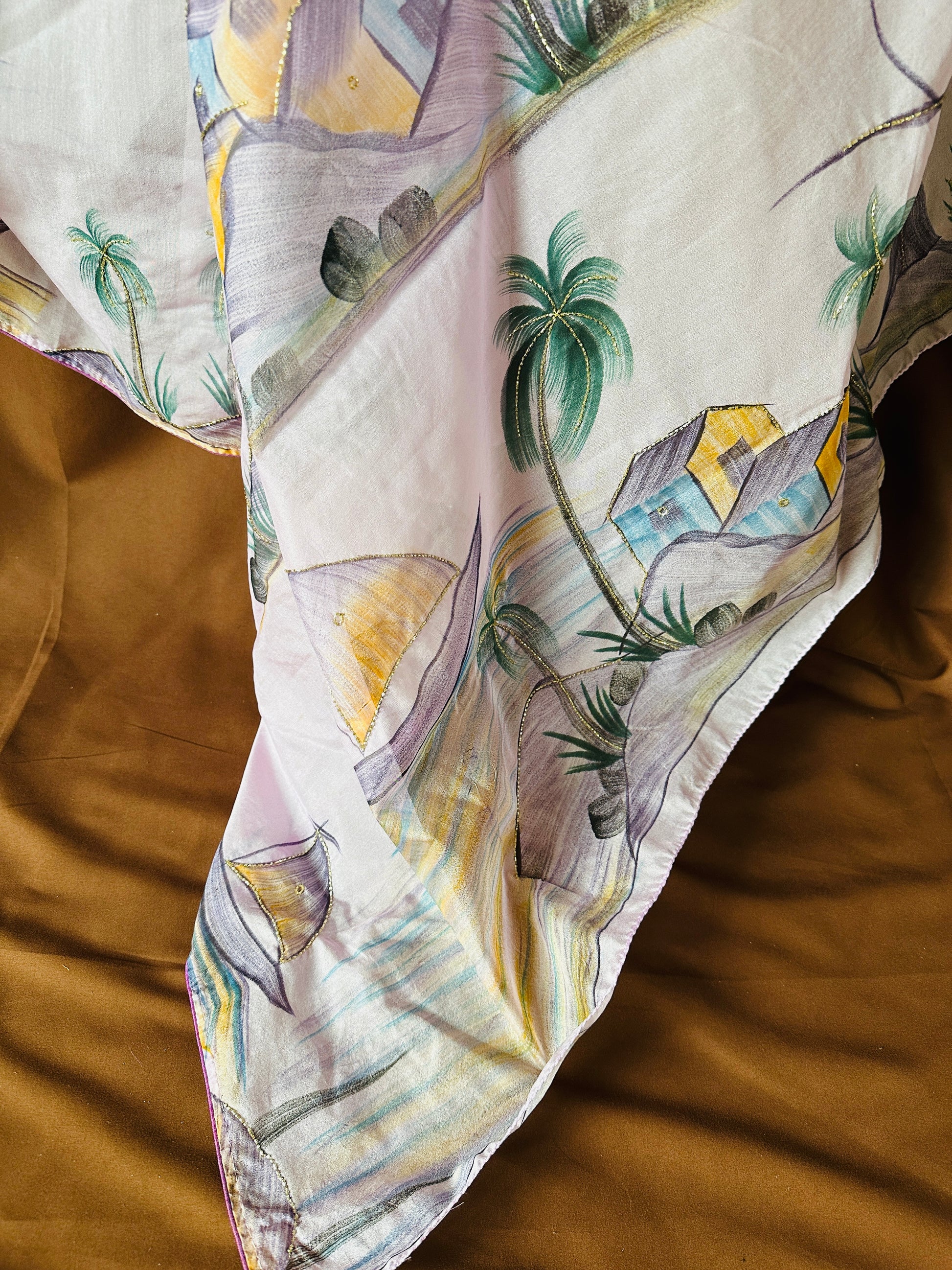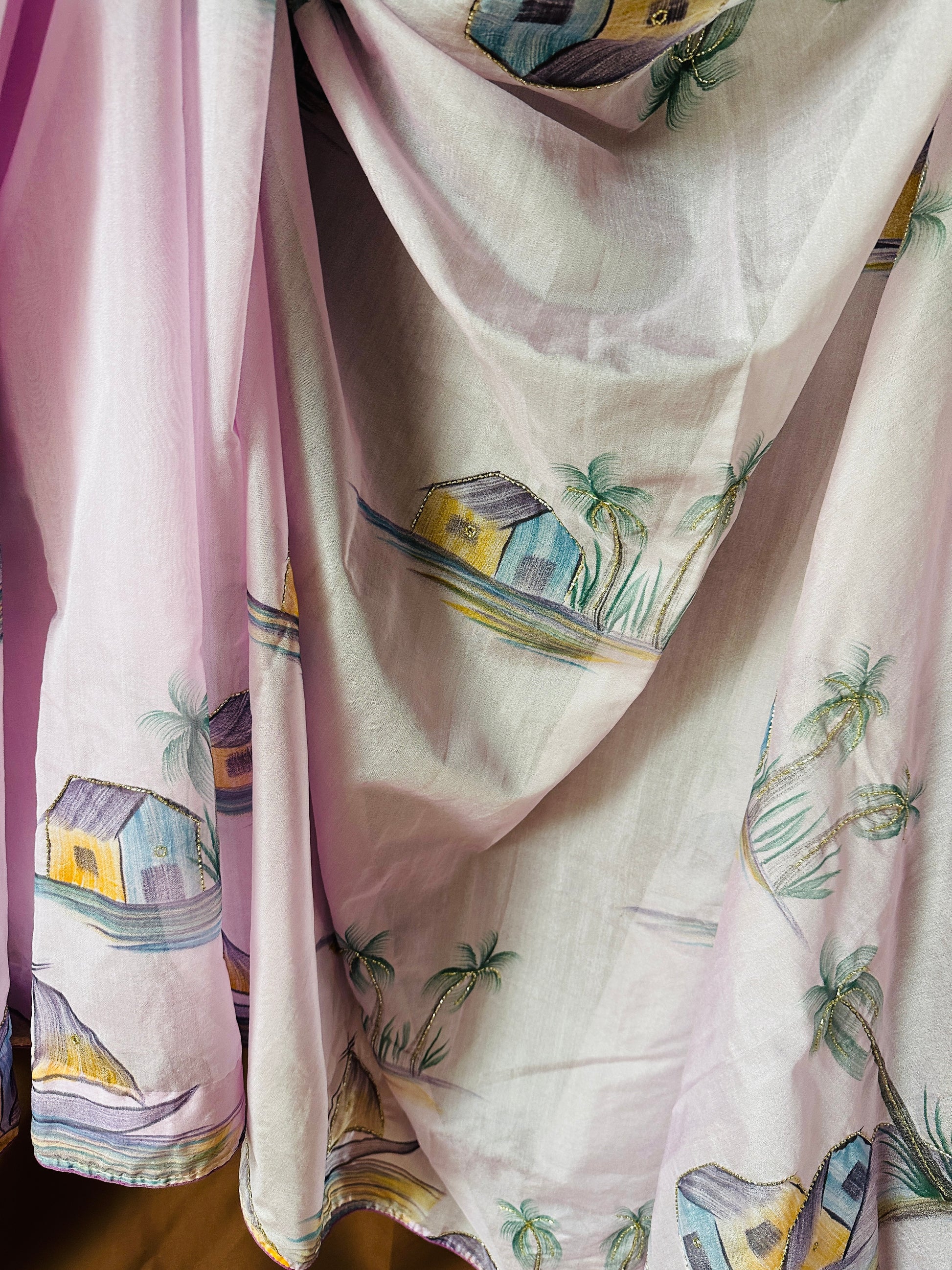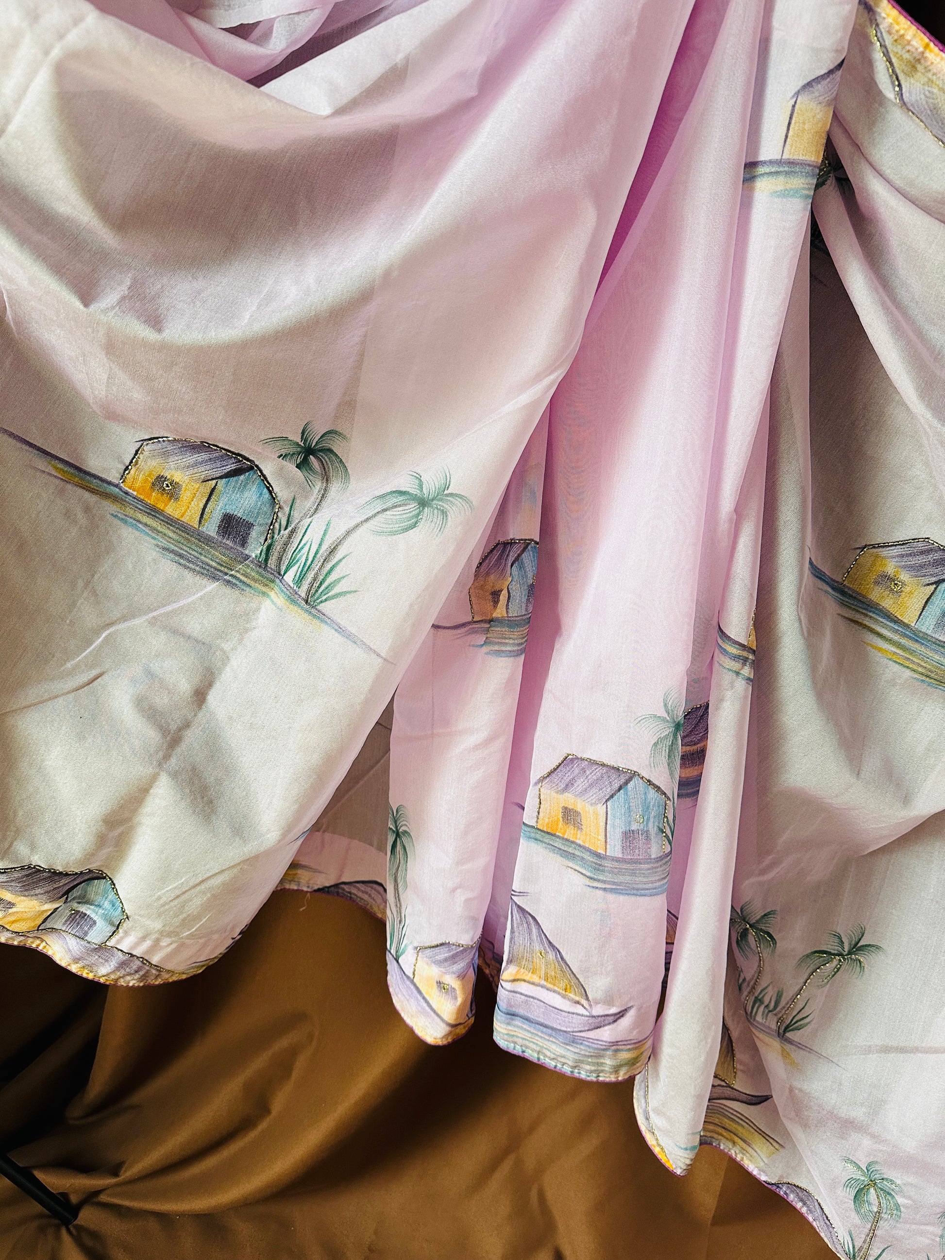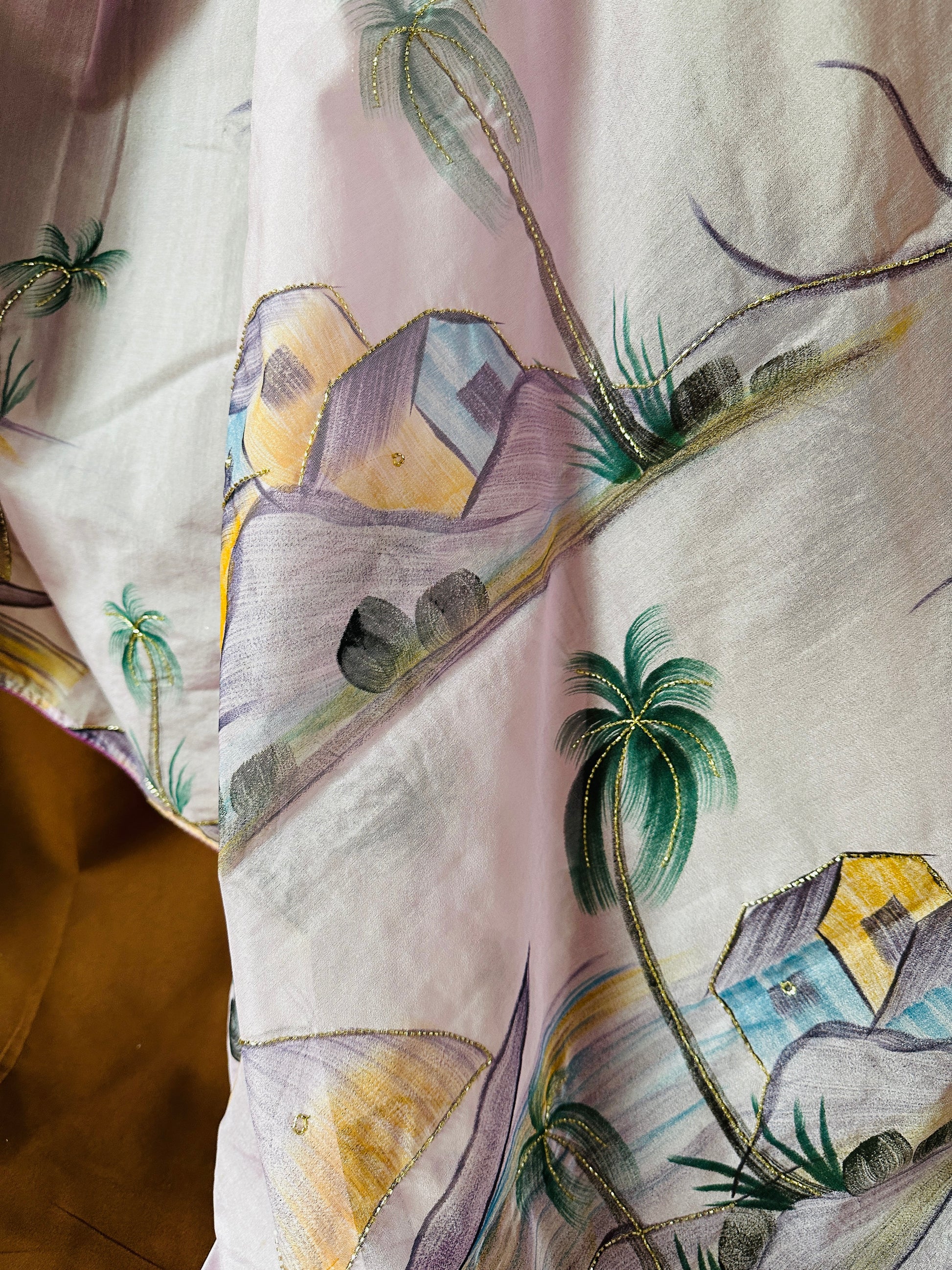 Step into a dream where craftsmanship meets art. This exquisite saree is handwoven in airy Kora Organza Banarasi, known for its gossamer lightness and sheer grace. Its lavender canvas becomes a storybook, brought alive through intricate hand-painting that captures a tranquil beachside scene—rolling valleys, rustic huts, swaying coconut trees, and ships gliding on a serene horizon.