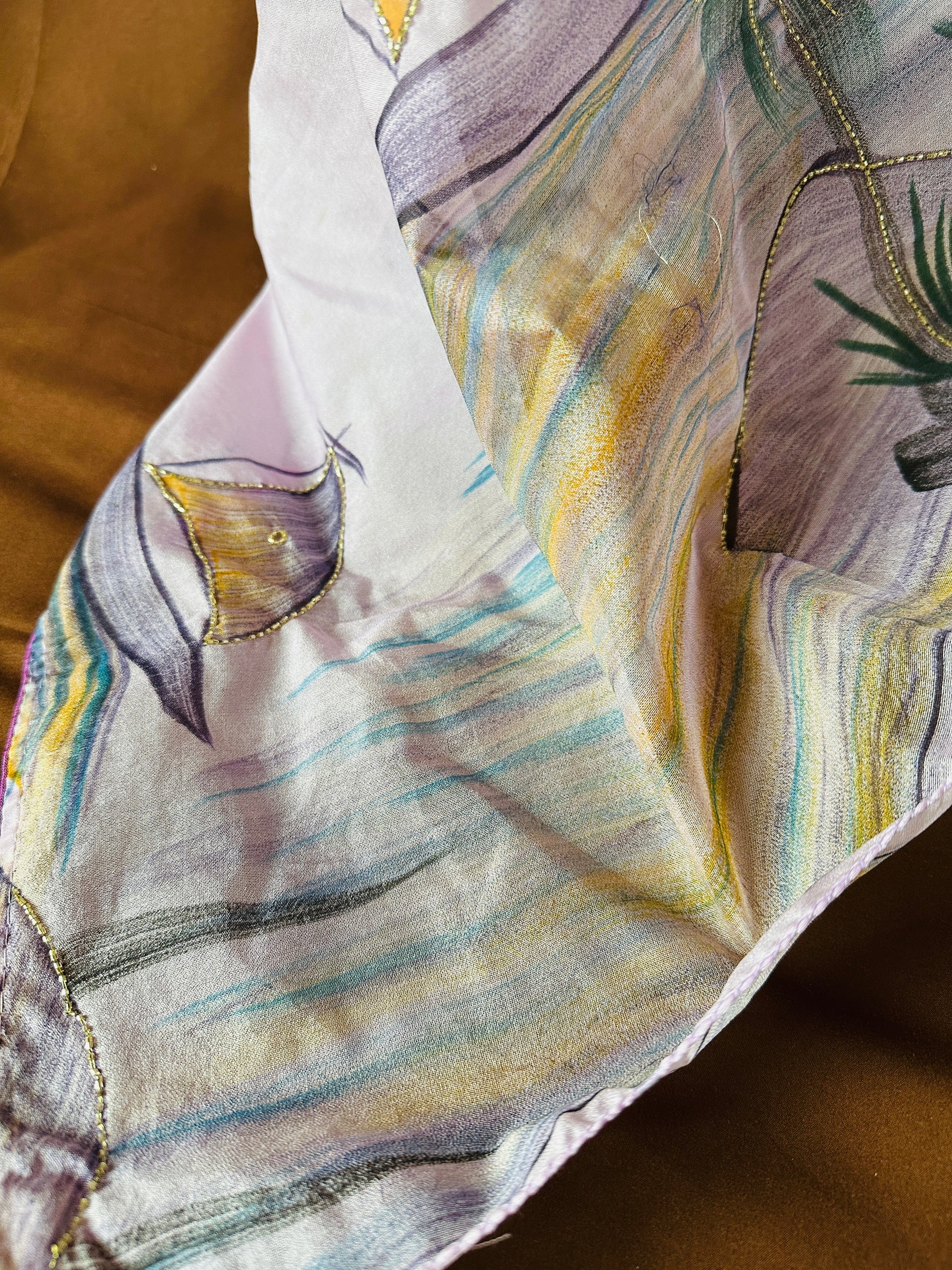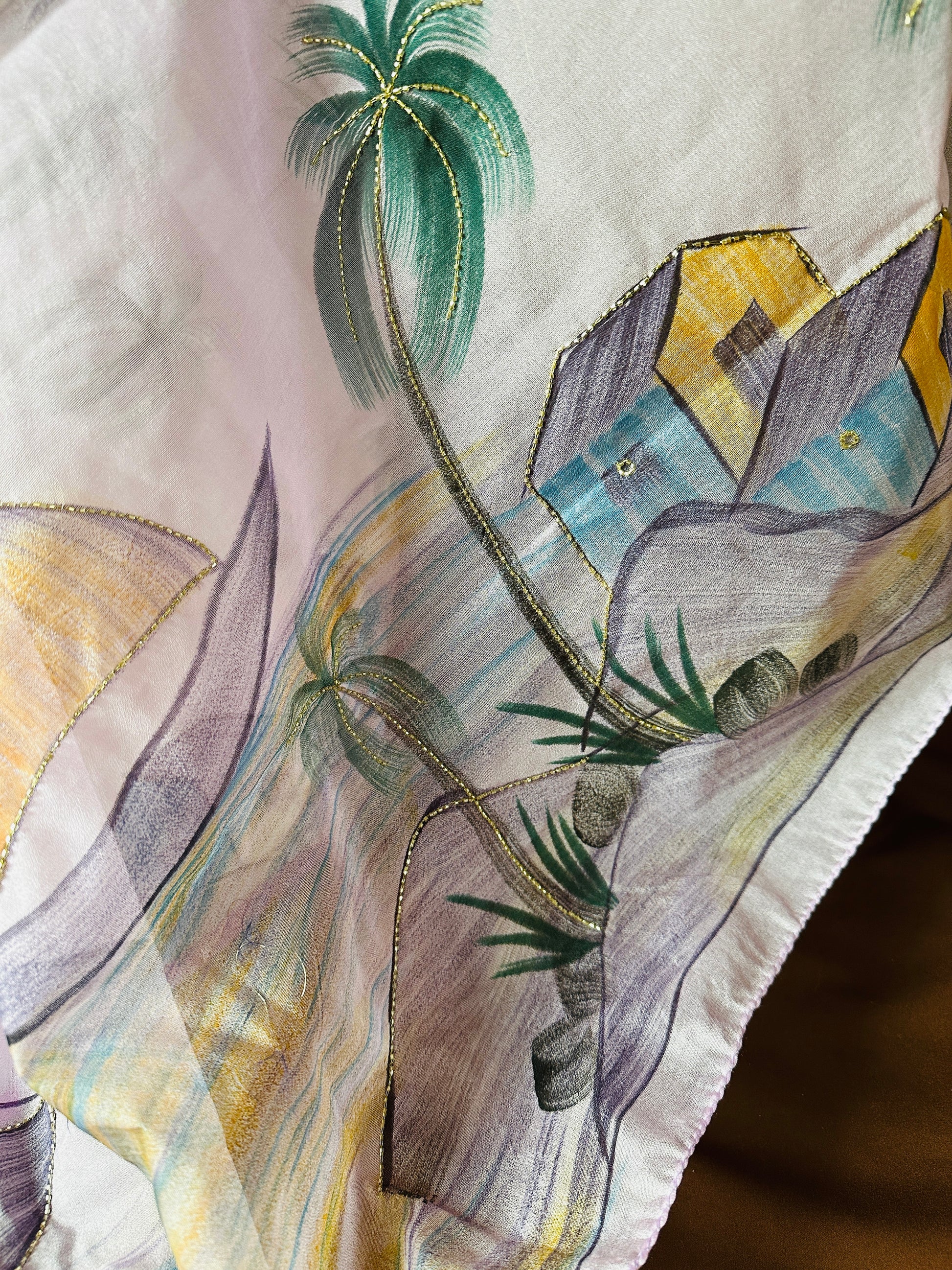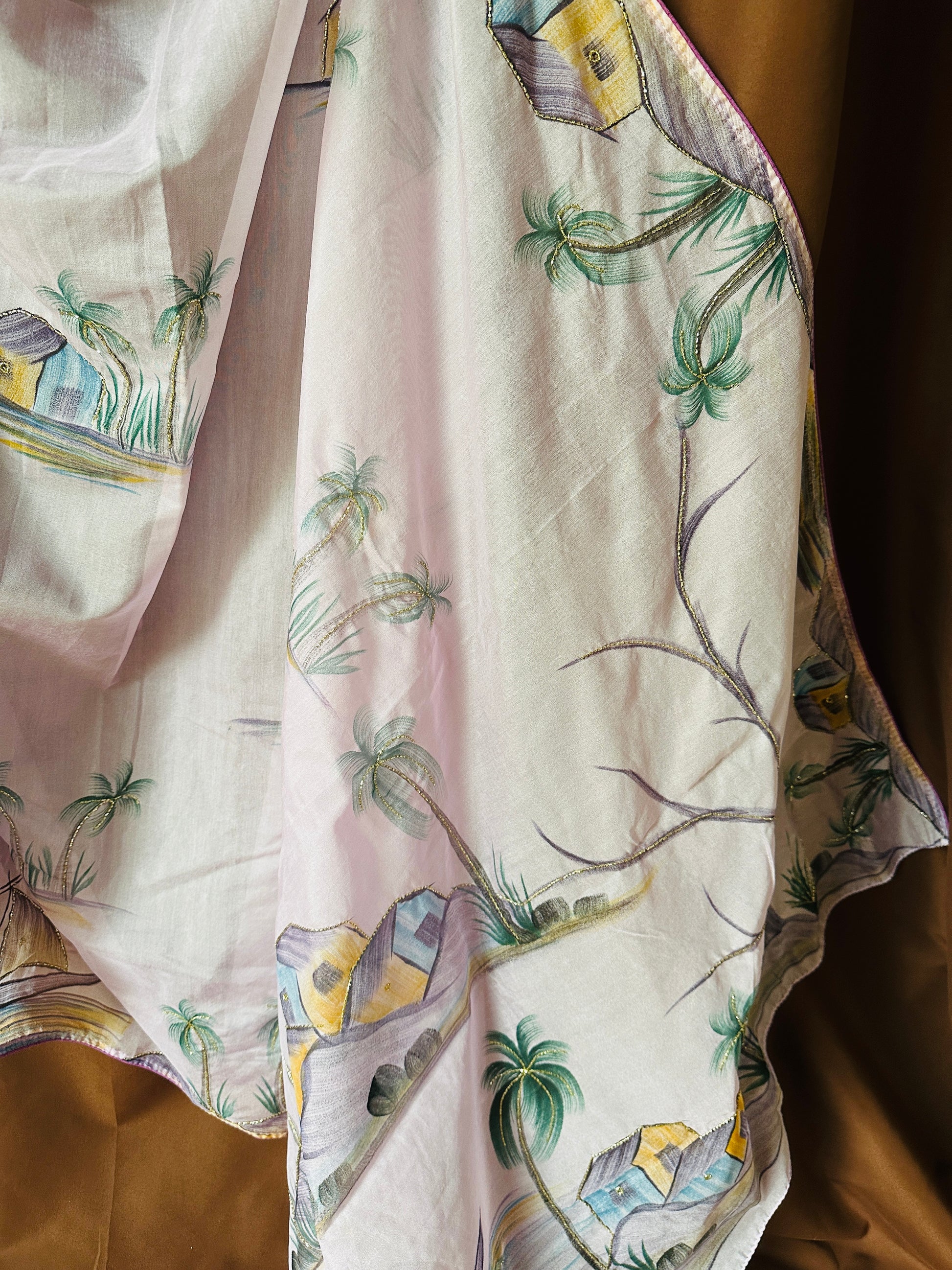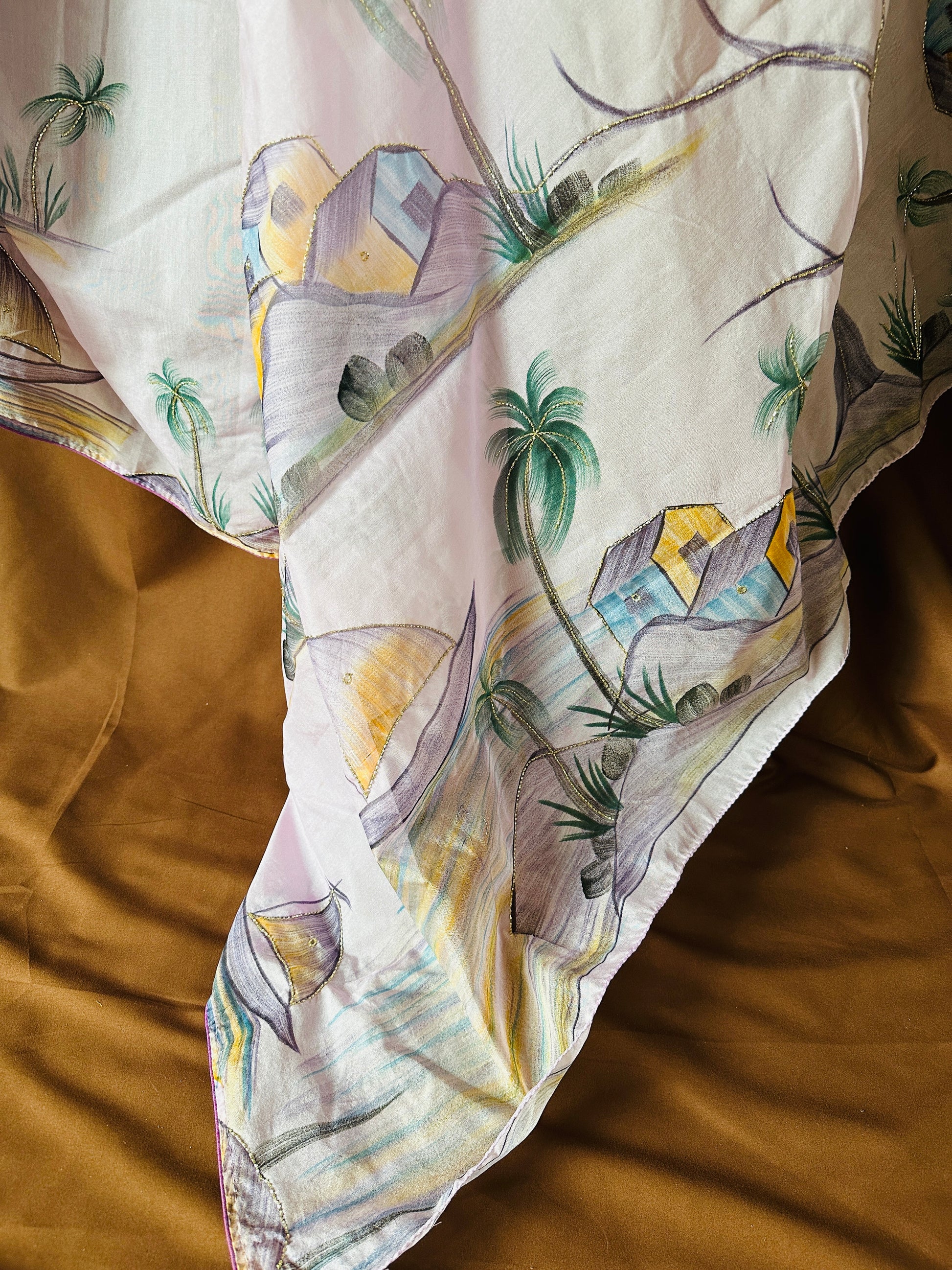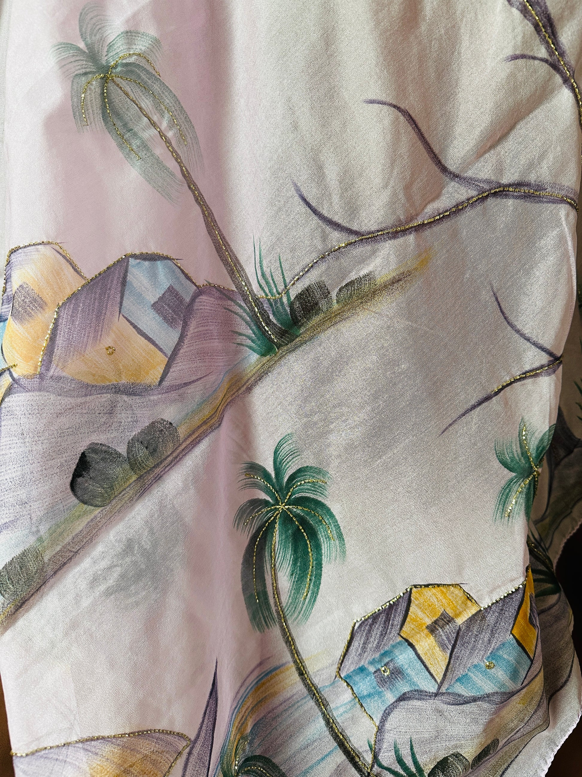 Step into a dream where craftsmanship meets art. This exquisite saree is handwoven in airy Kora Organza Banarasi, known for its gossamer lightness and sheer grace. Its lavender canvas becomes a storybook, brought alive through intricate hand-painting that captures a tranquil beachside scene—rolling valleys, rustic huts, swaying coconut trees, and ships gliding on a serene horizon.