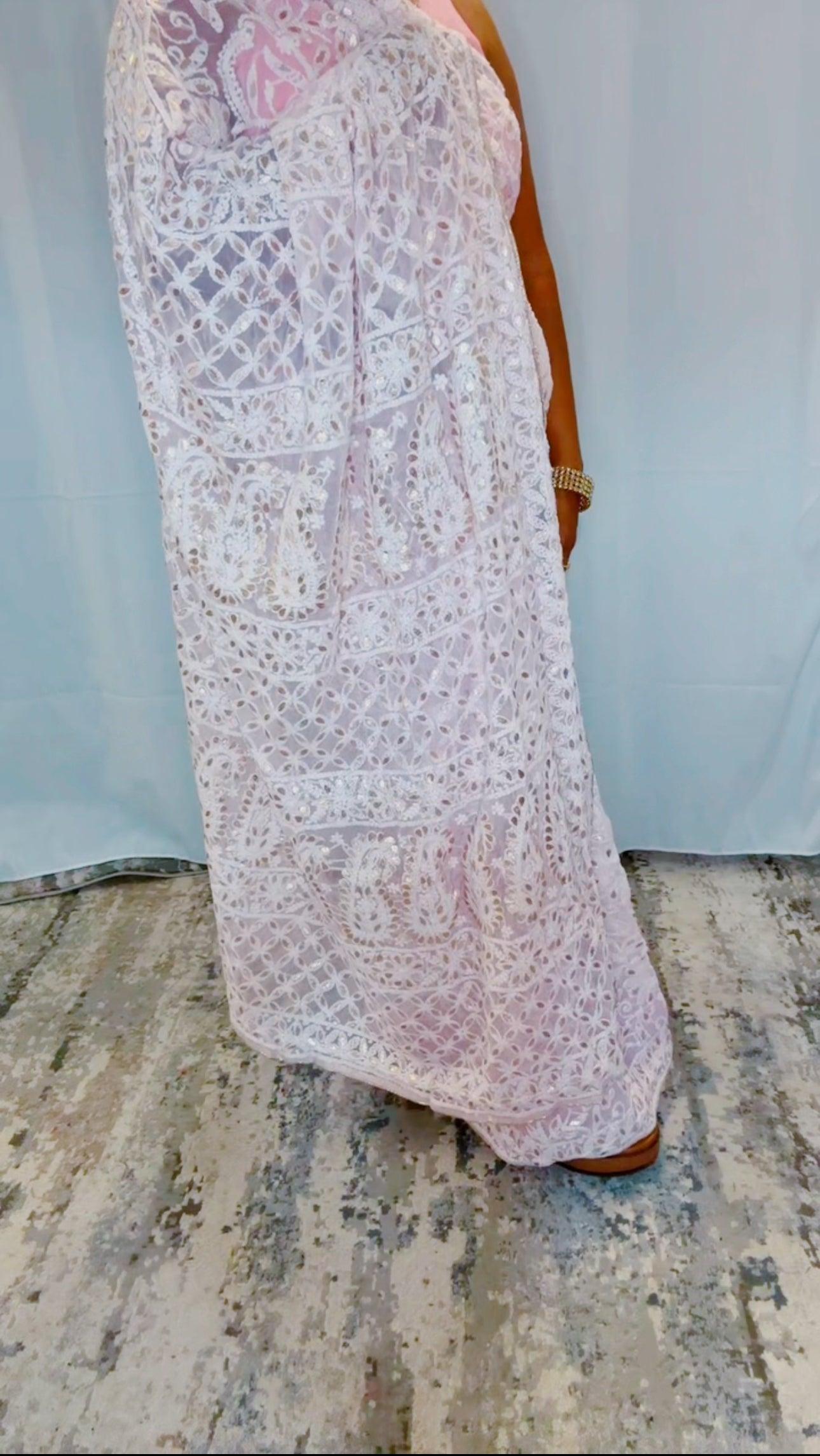 Authentic Hand Lucknowi Chikankari Full Jaal with Gotta Patti Georgette Saree Pastel Pink