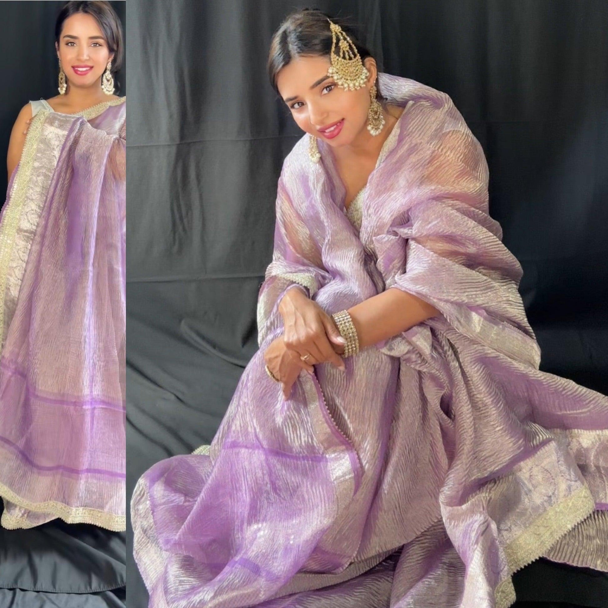 Adorn this Pure Crushed tissue silk saree in silver zari with designer gotta details .... beautiful to the core and timeless . Luxurious fabric with softness and sheen just remarkable.