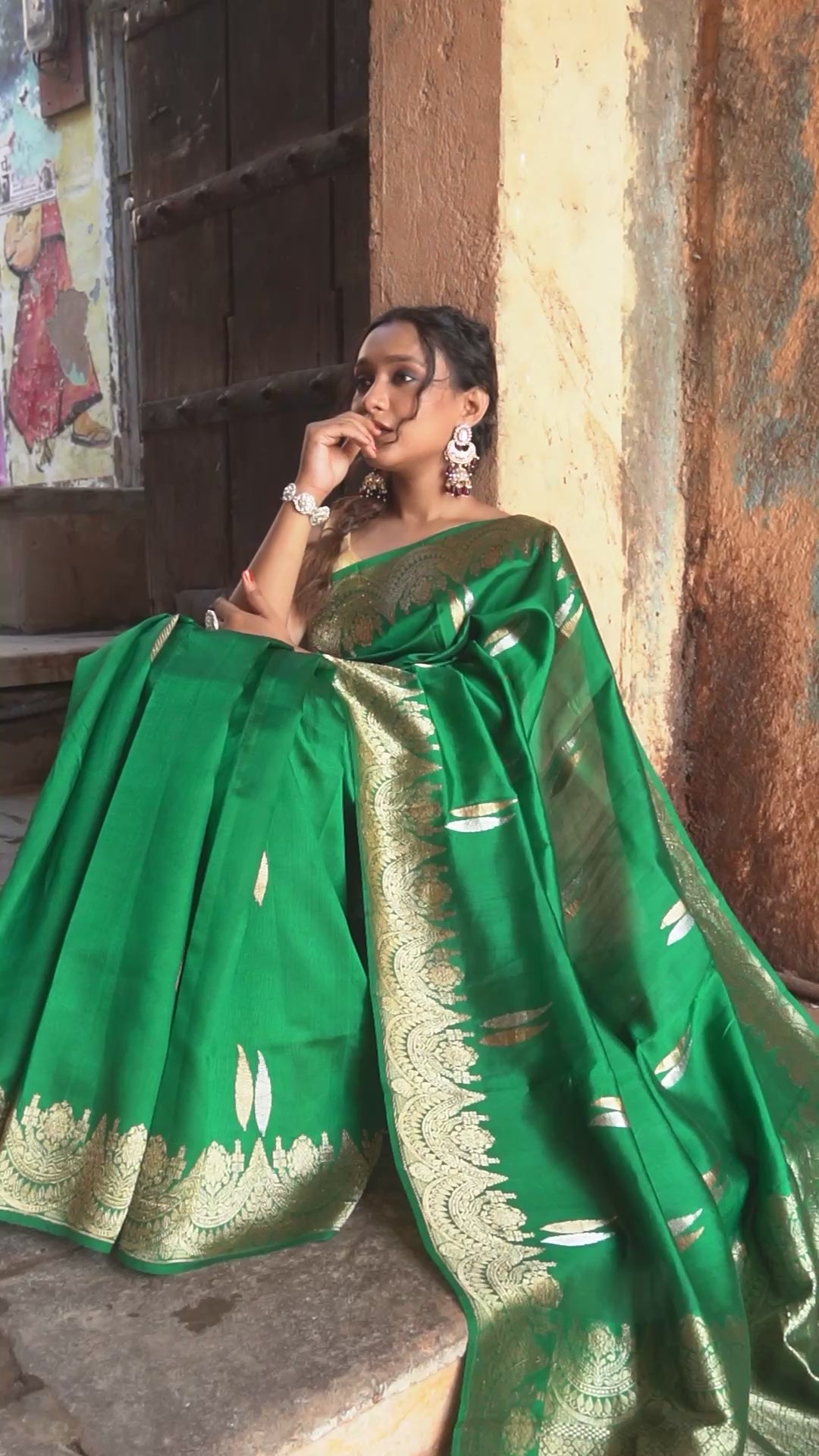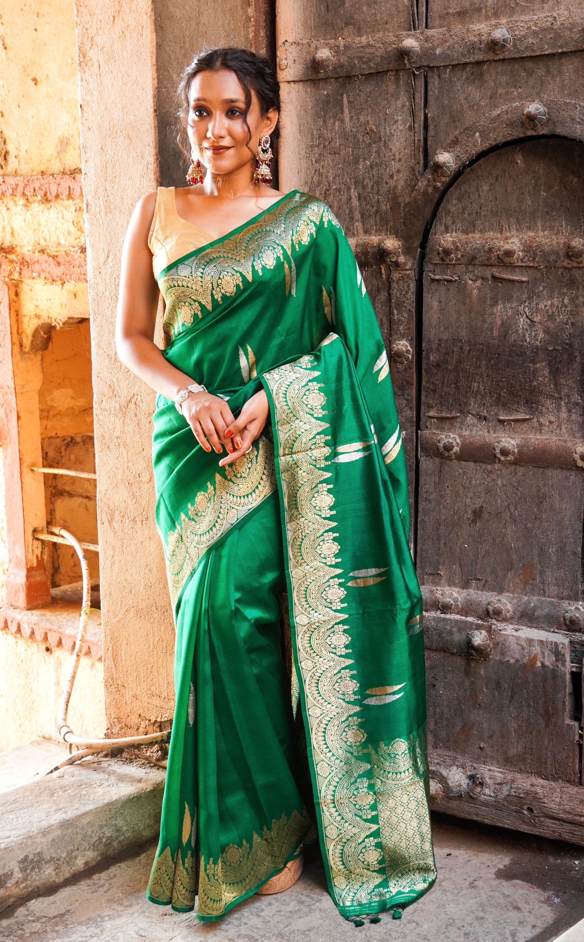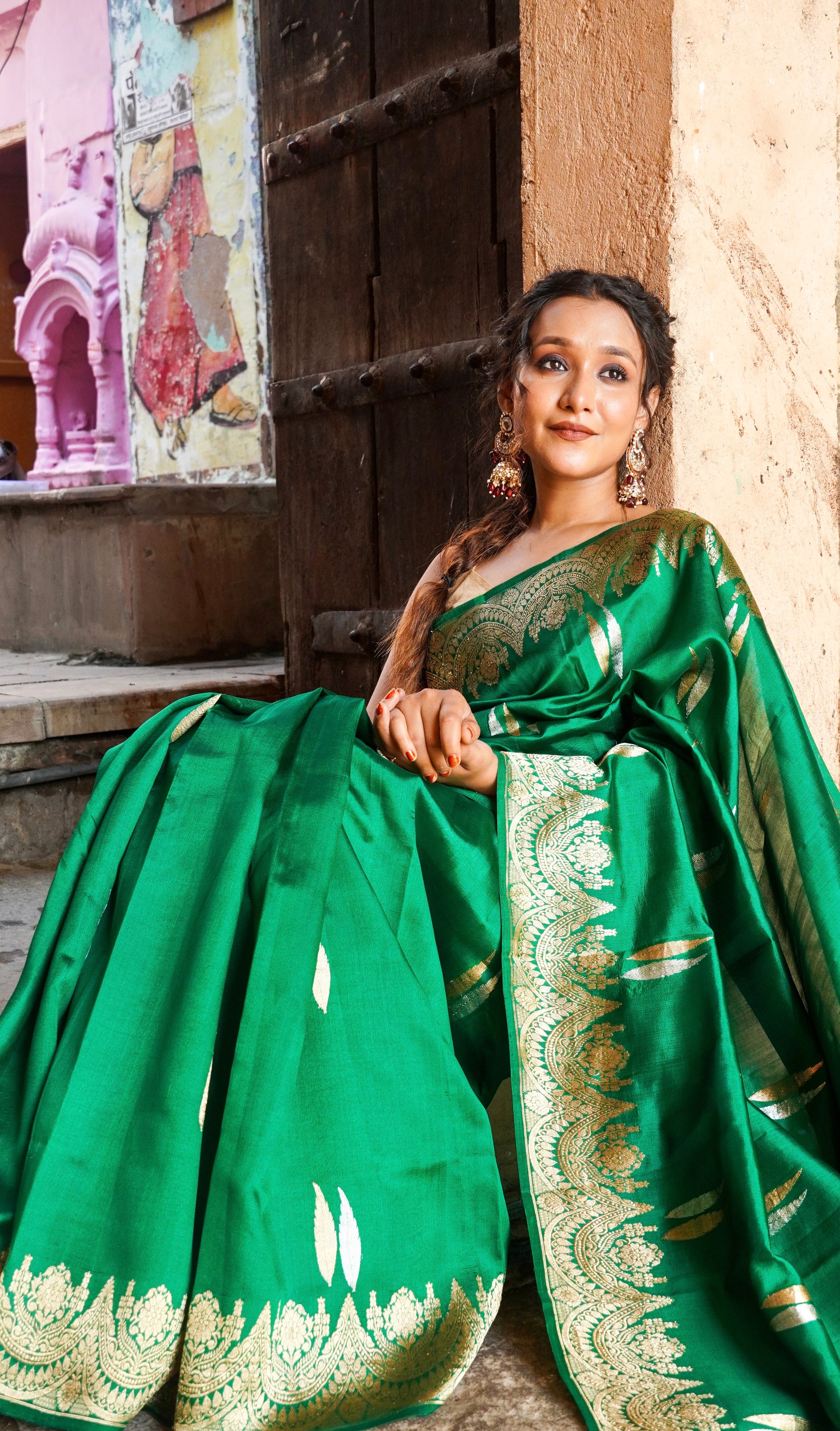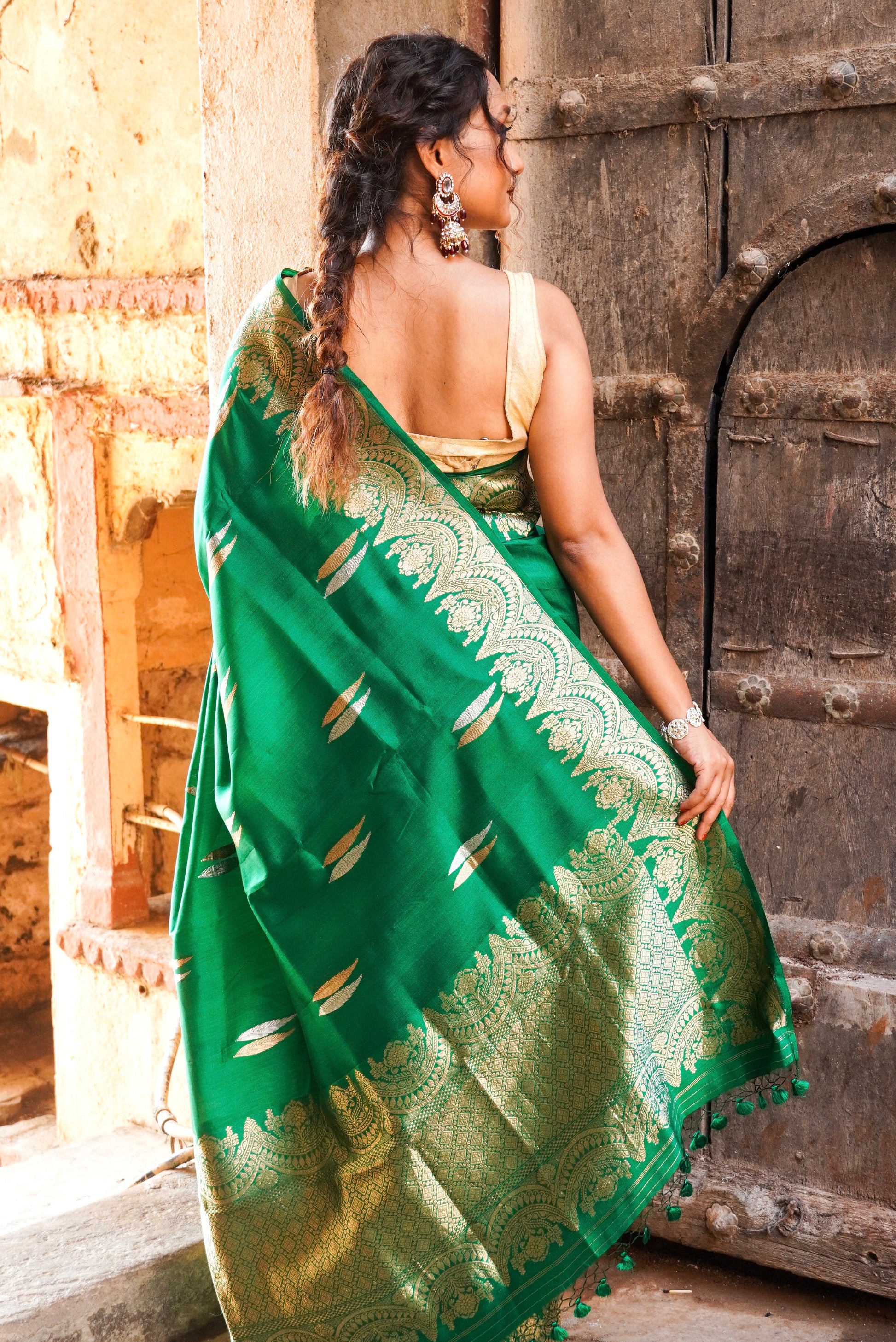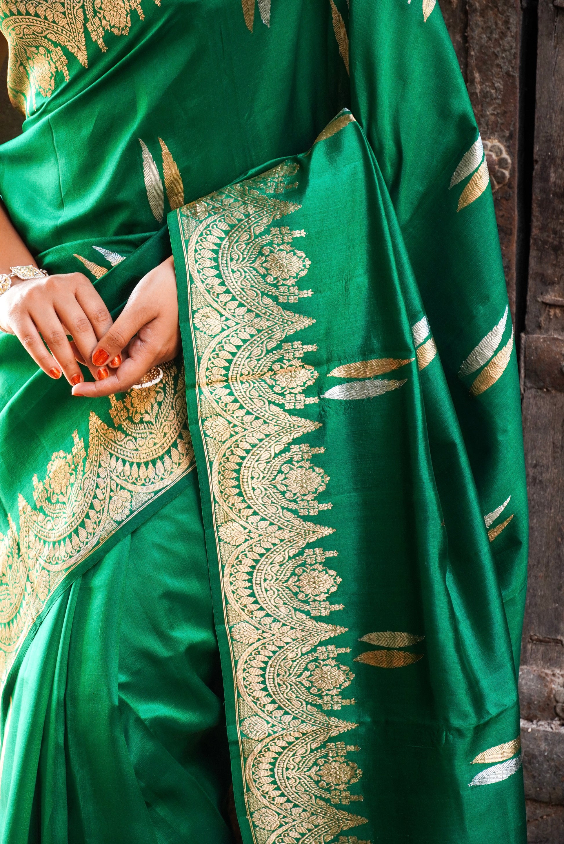 Banarasi Pure Katan by Mashru Silk Handwoven Saree - Sona Rupa - Kaduwa Green