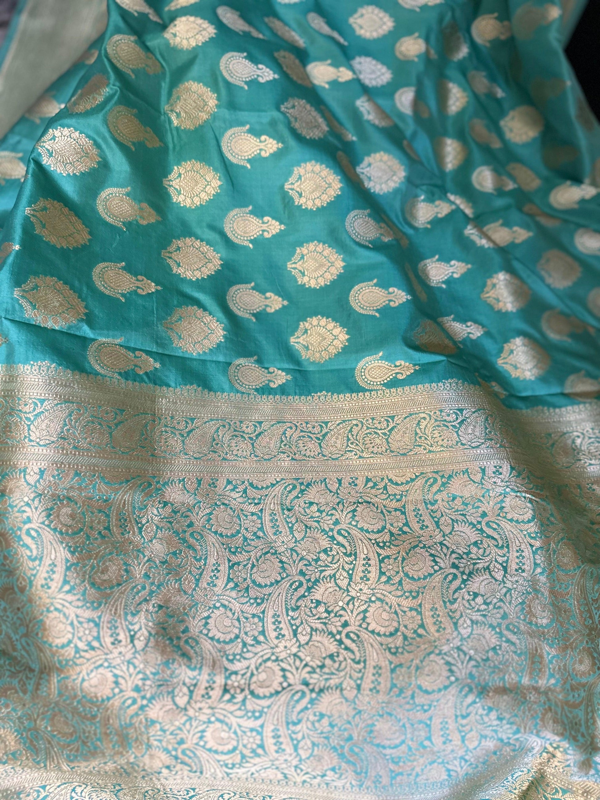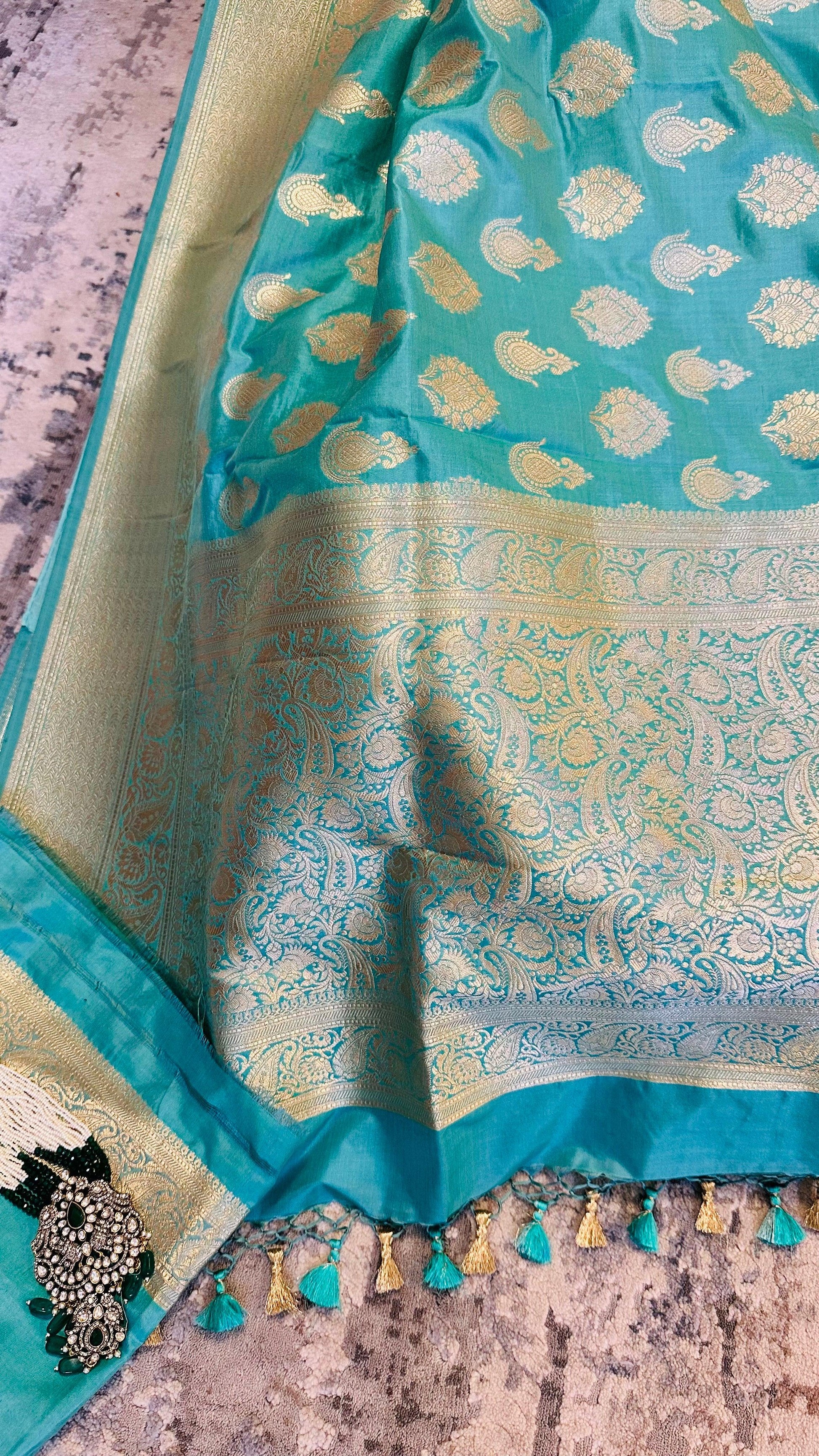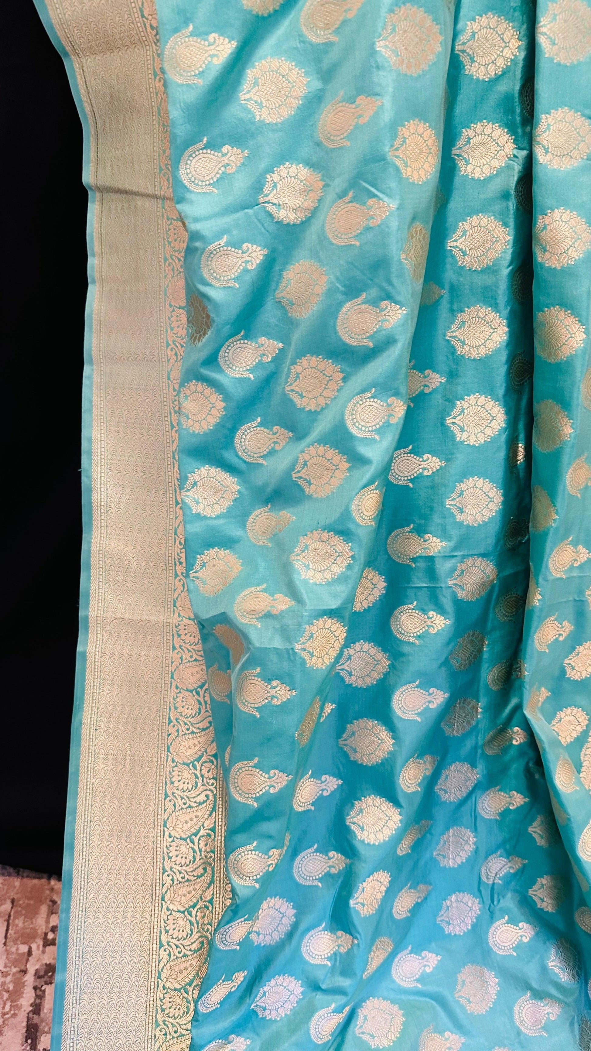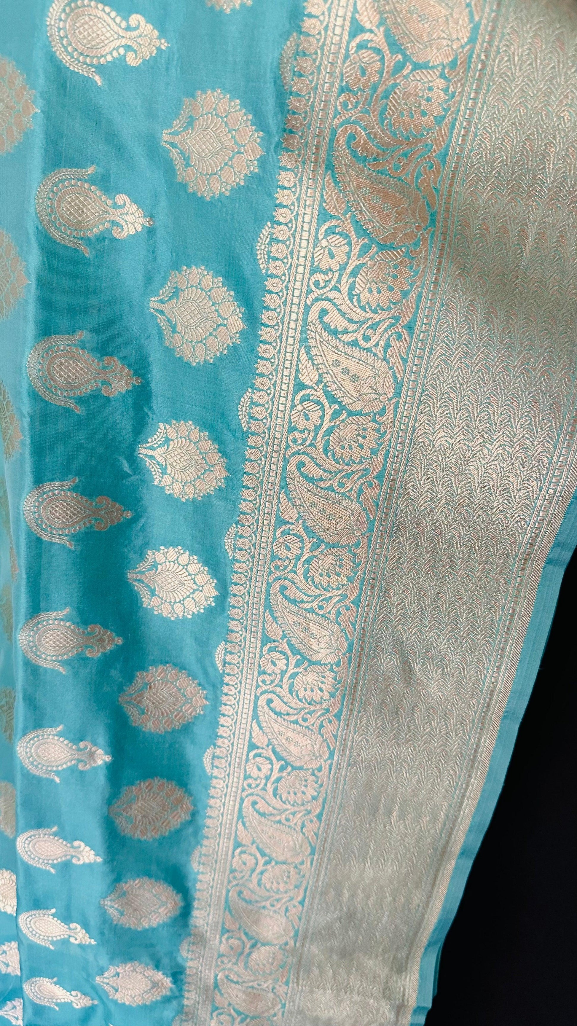 Embrace ethereal elegance with our Sea Blue Katan Silk Saree adorned with lustrous gold zari.