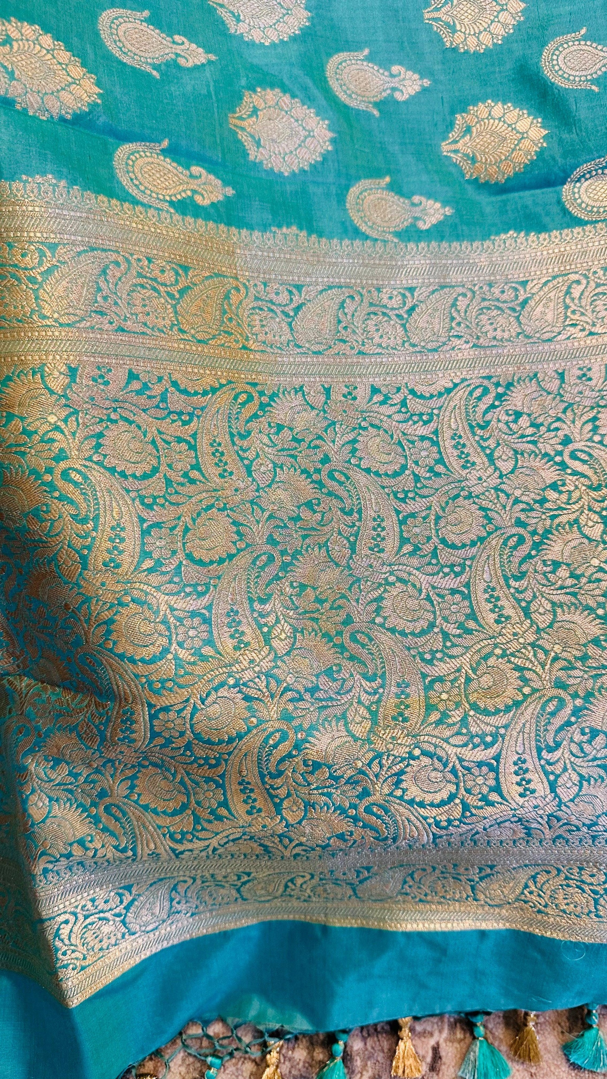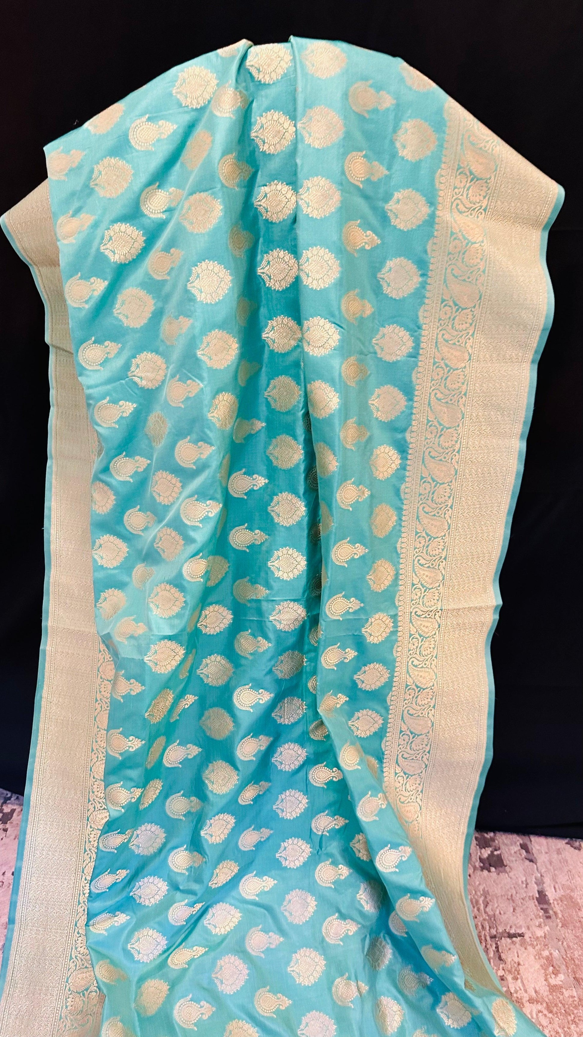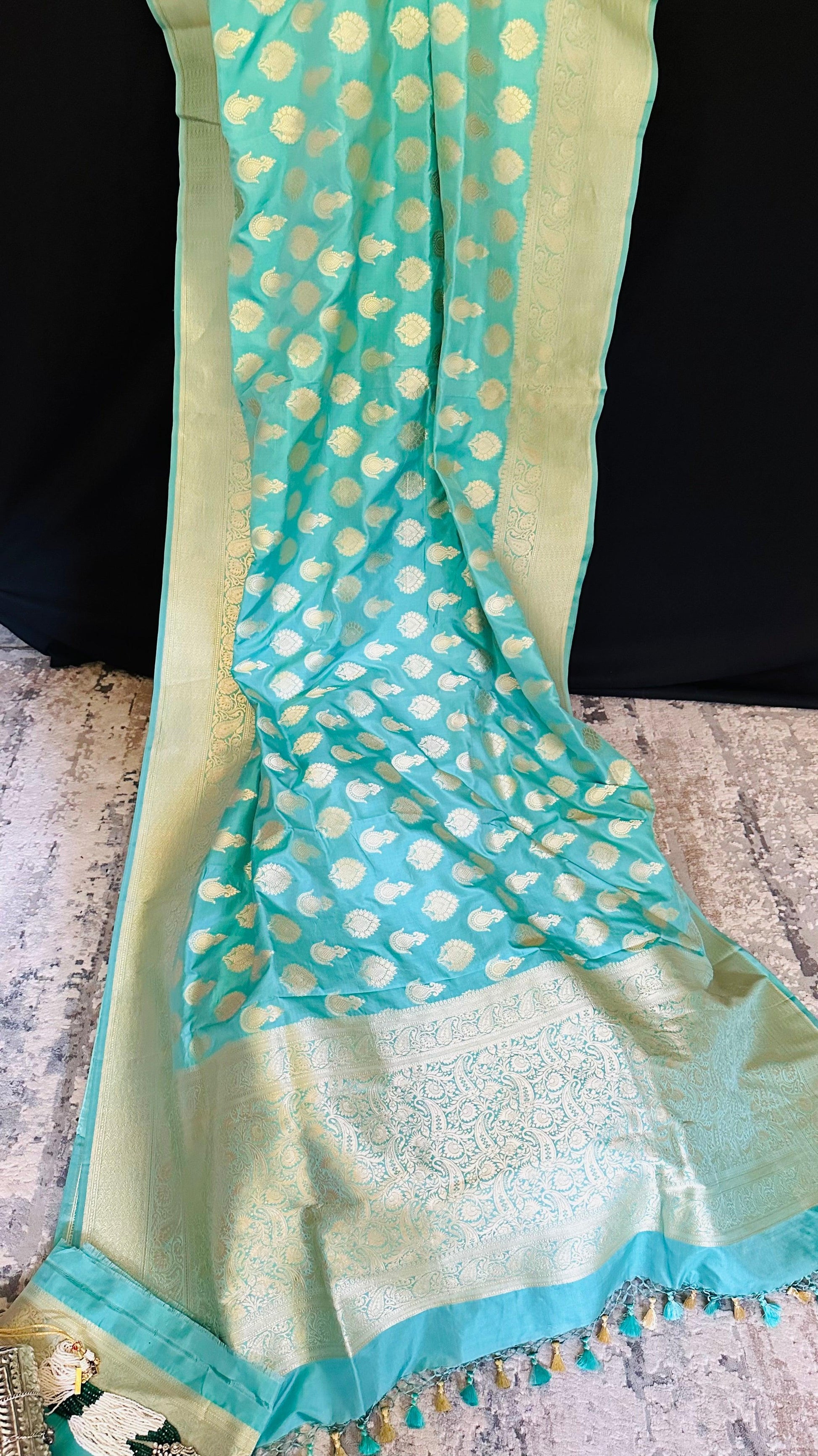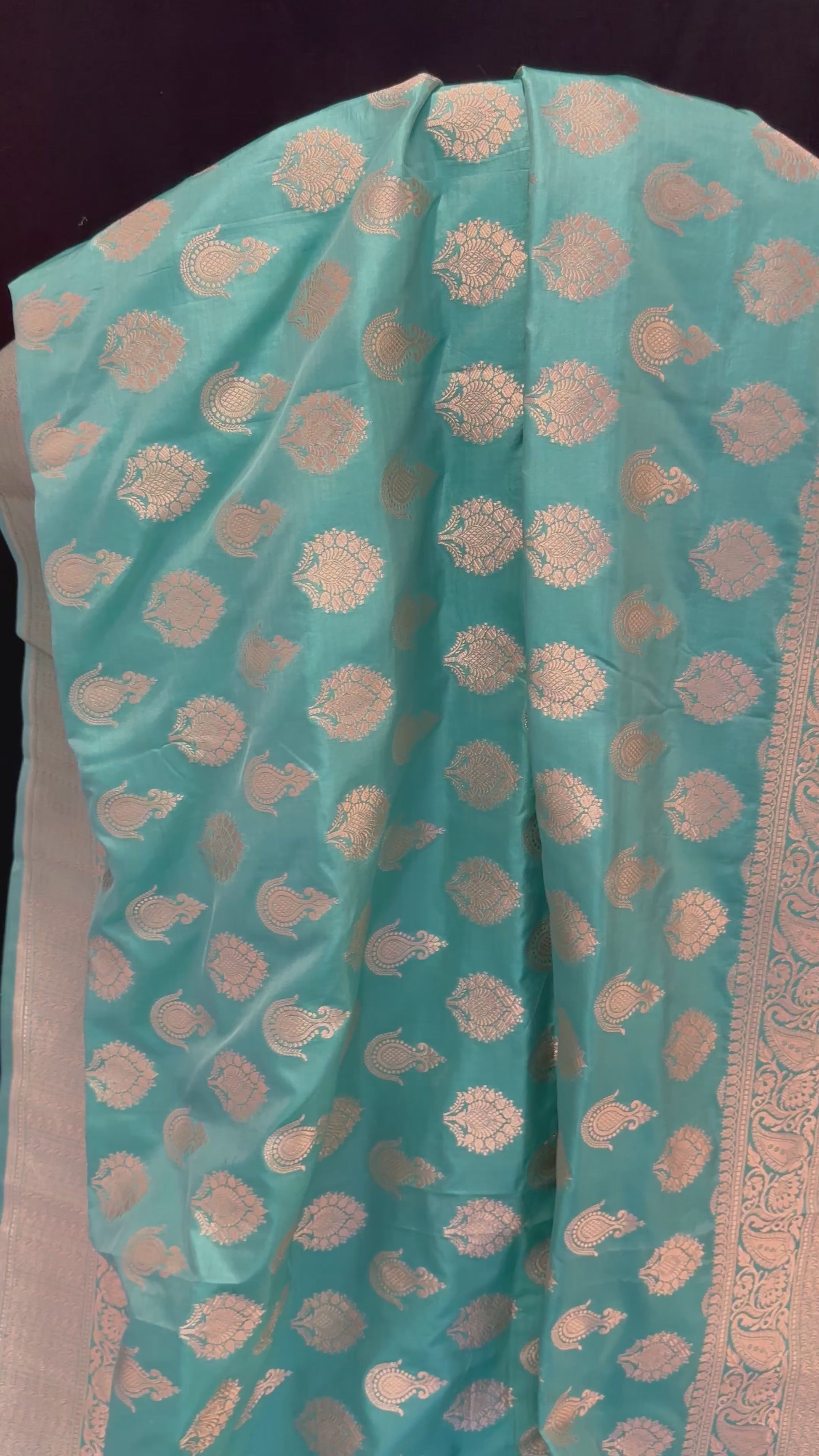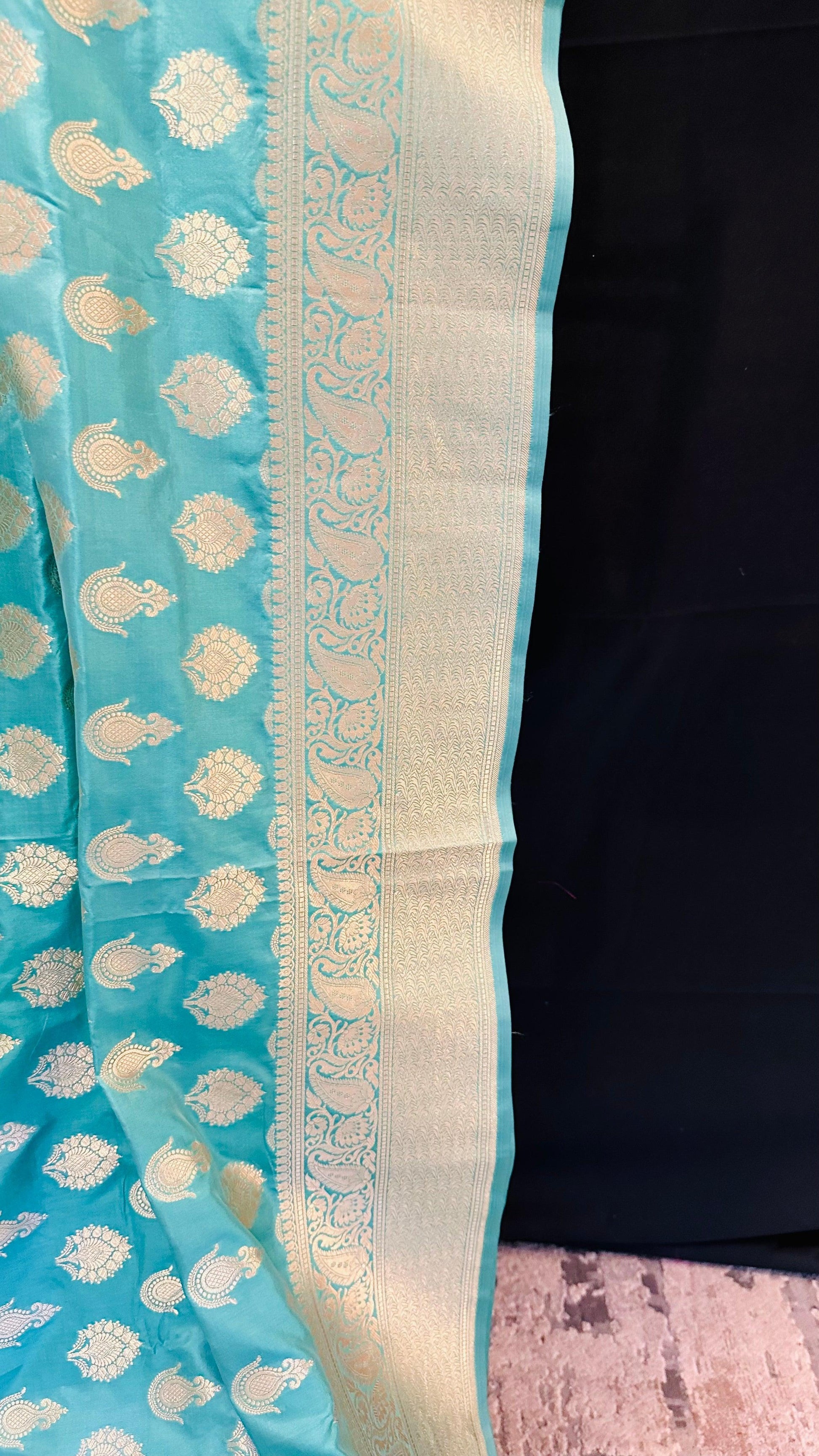 Embrace ethereal elegance with our Sea Blue Katan Silk Saree adorned with lustrous gold zari.