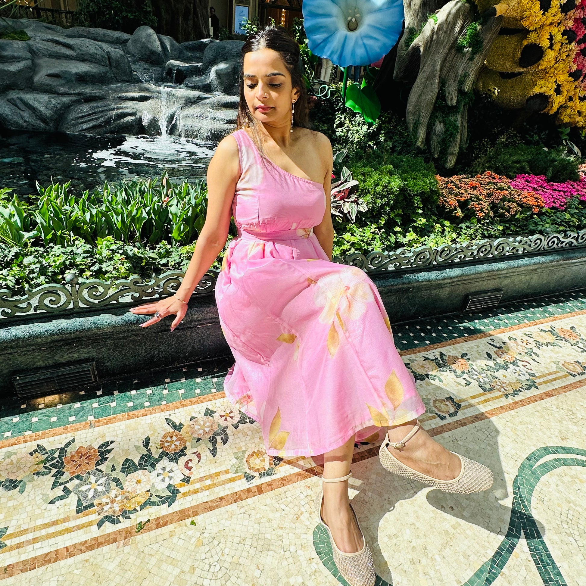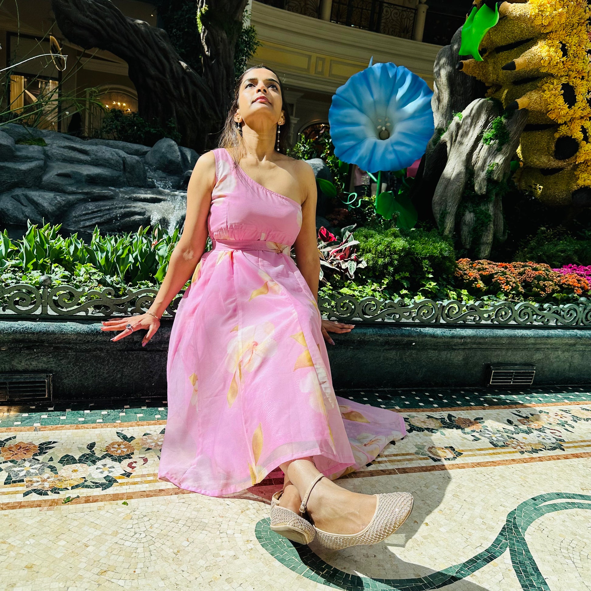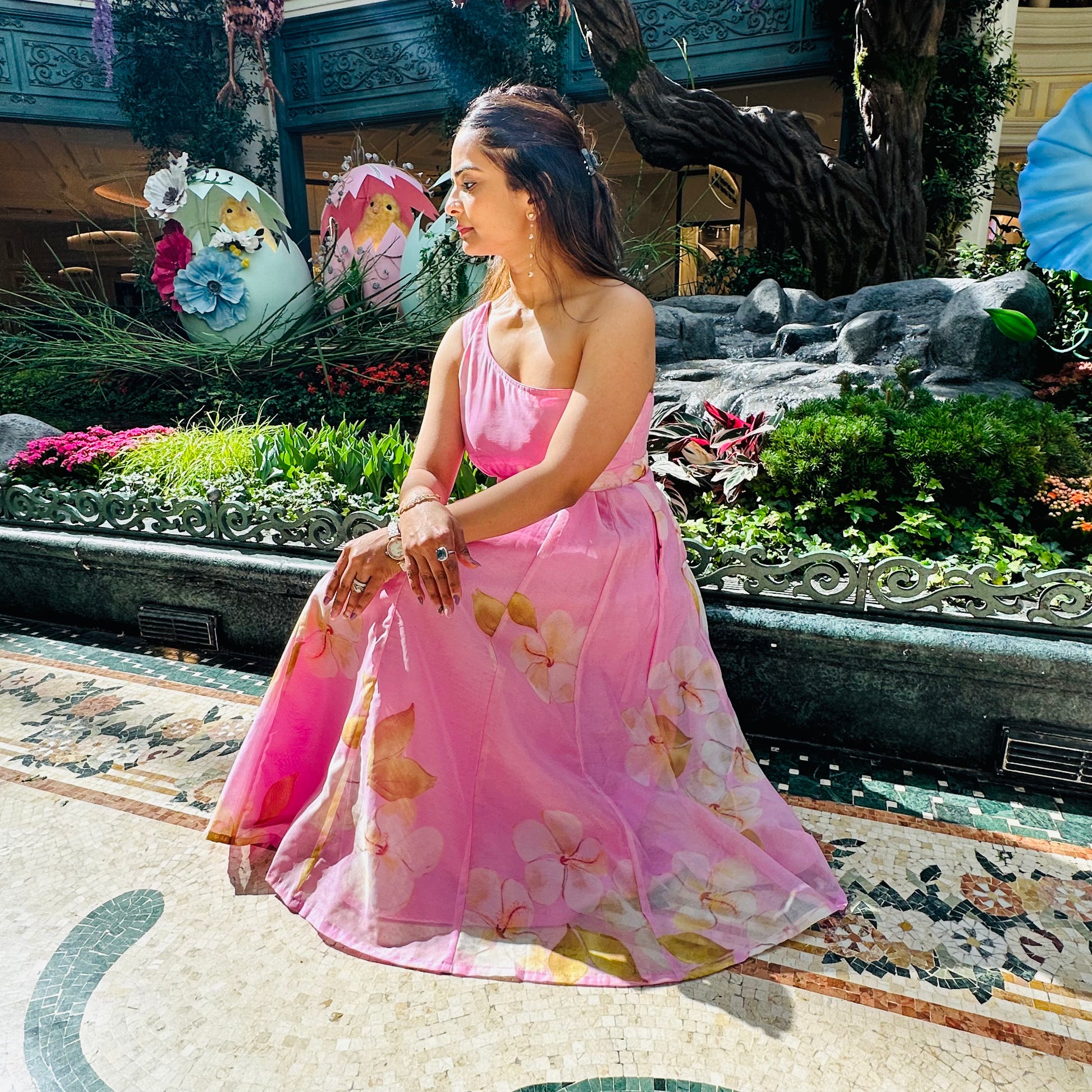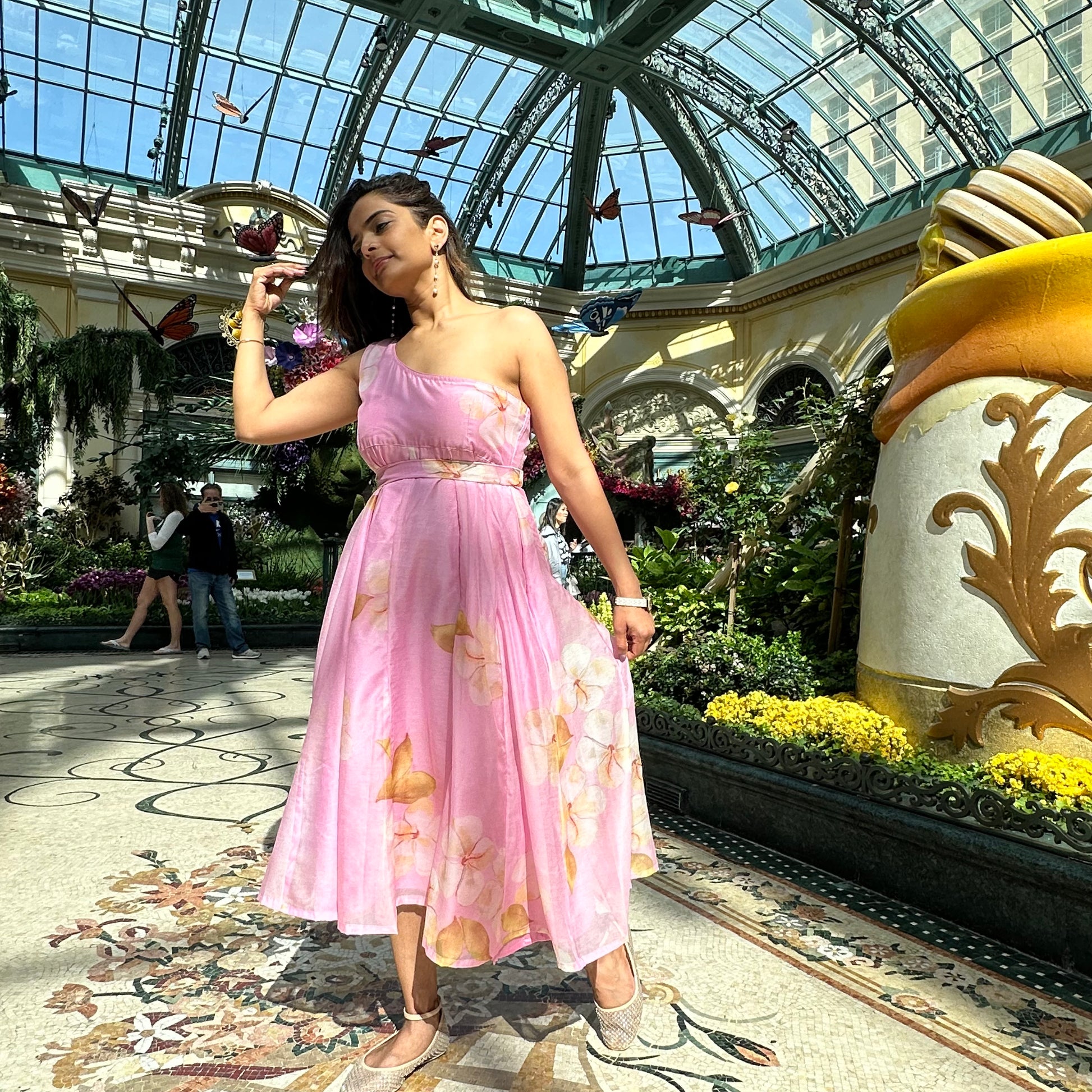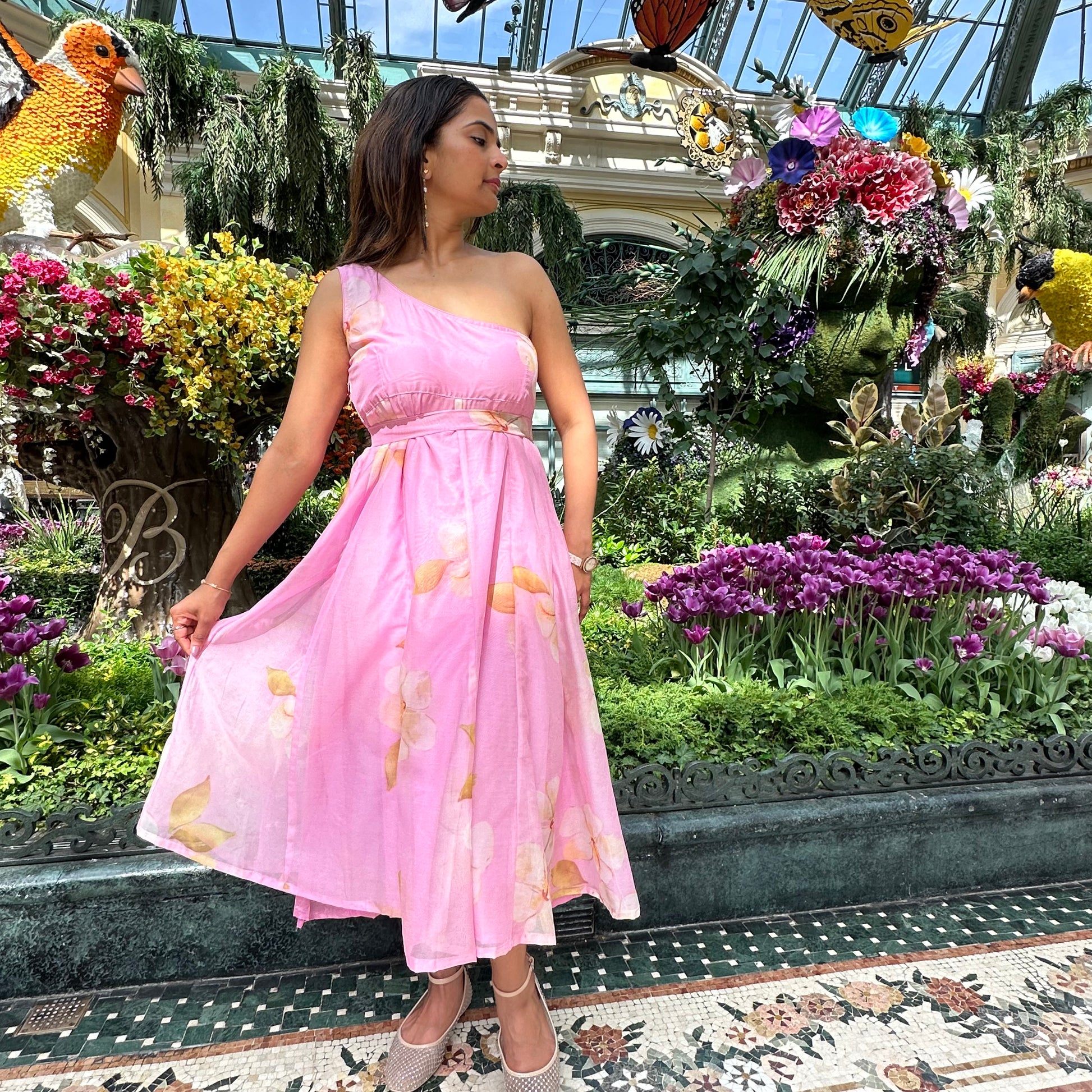 Step into soft romance with the Blossom One-Shoulder Dress. Crafted in a dreamy blend of organza and chiffon with delicate pink florals, this midi-length silhouette drapes effortlessly across the body. The asymmetric neckline adds just the right amount of drama, while the side zip and full lining ensure comfort and ease.