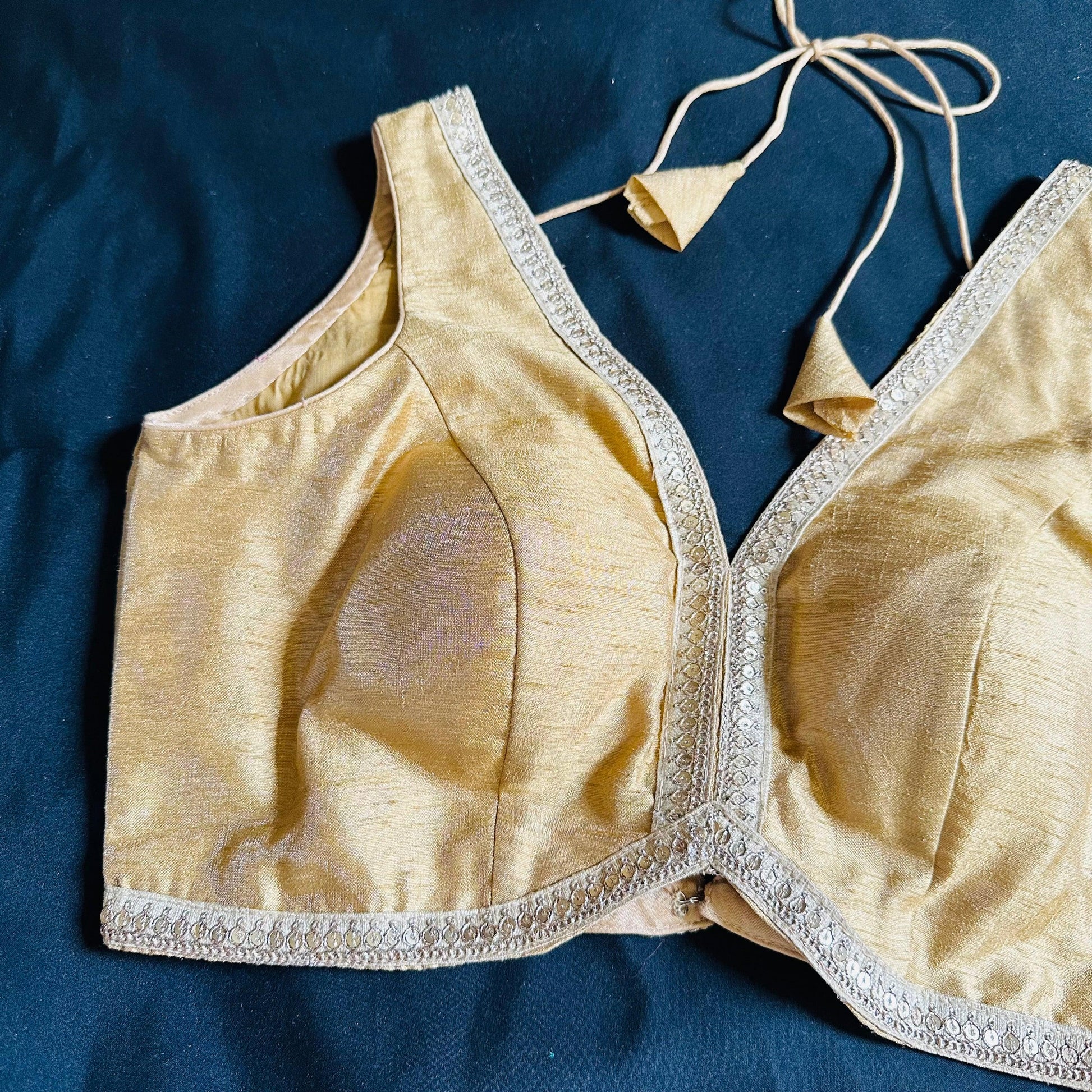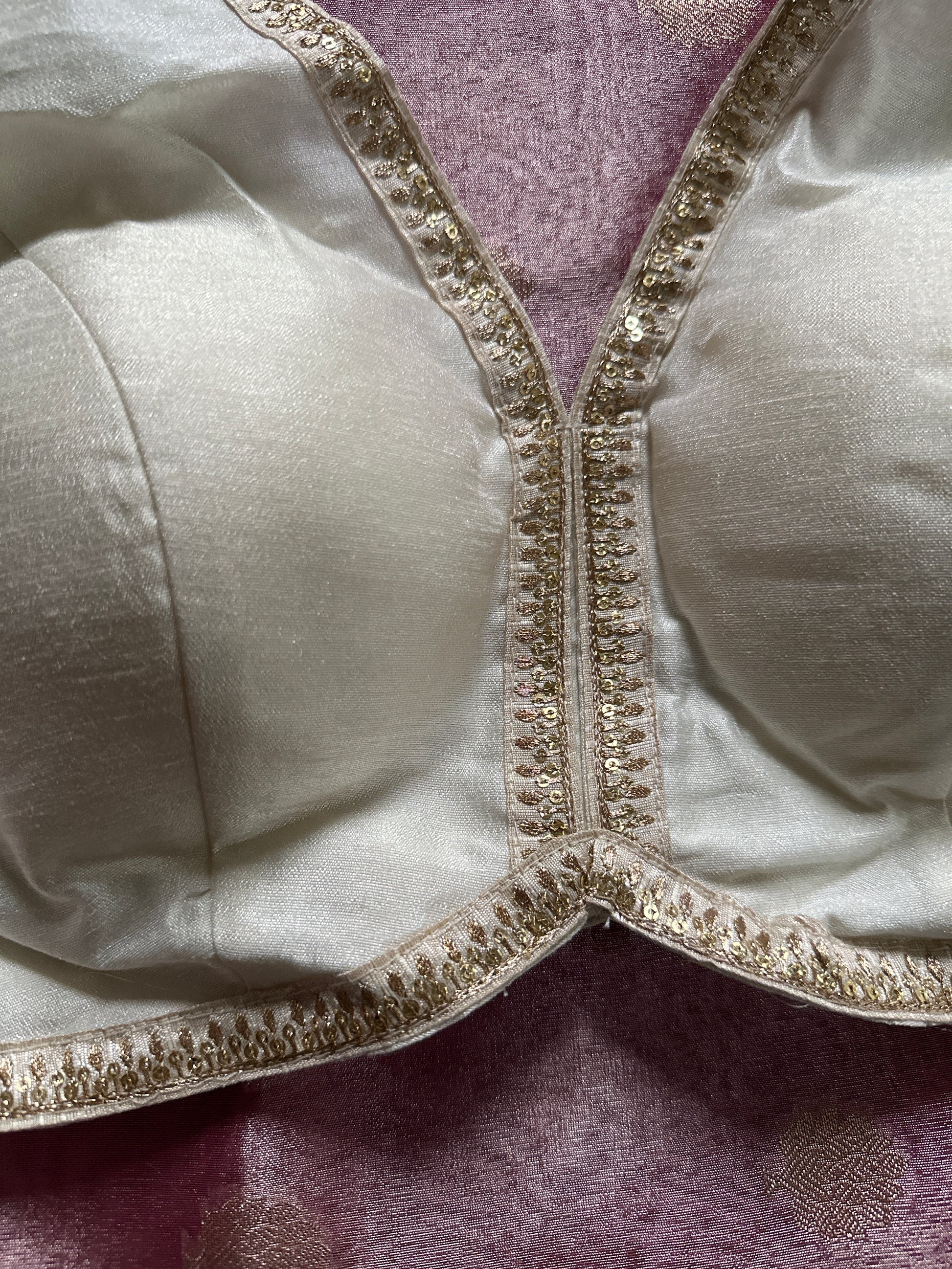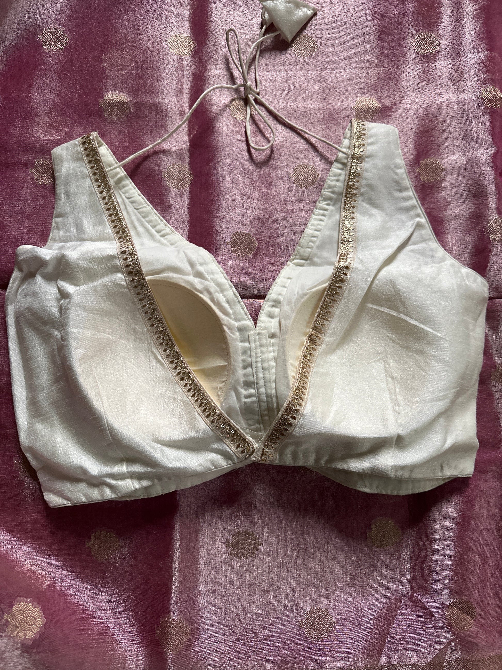 Deep V neck Ivory / Beige Blouse- Raw Silk - Padded