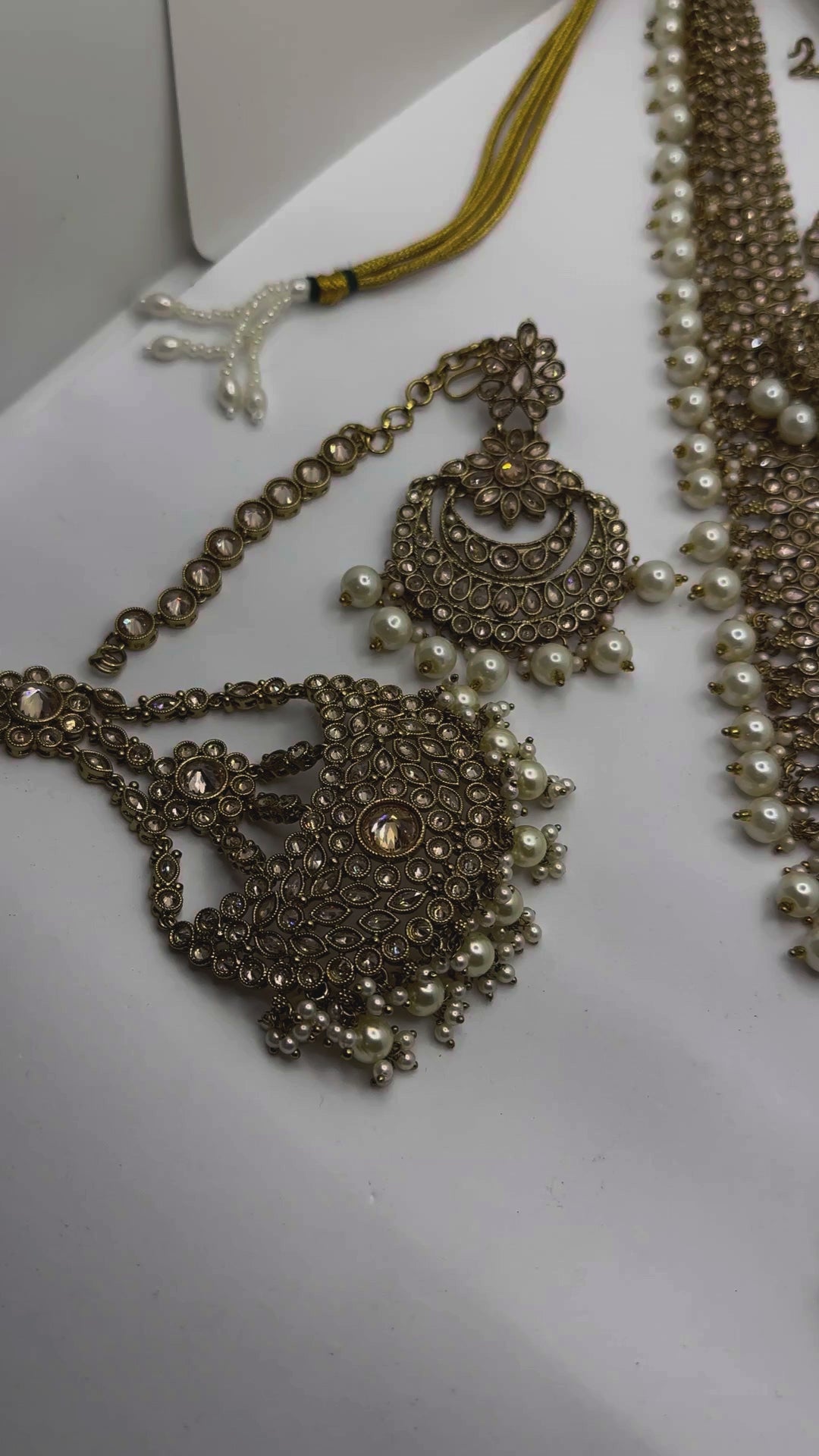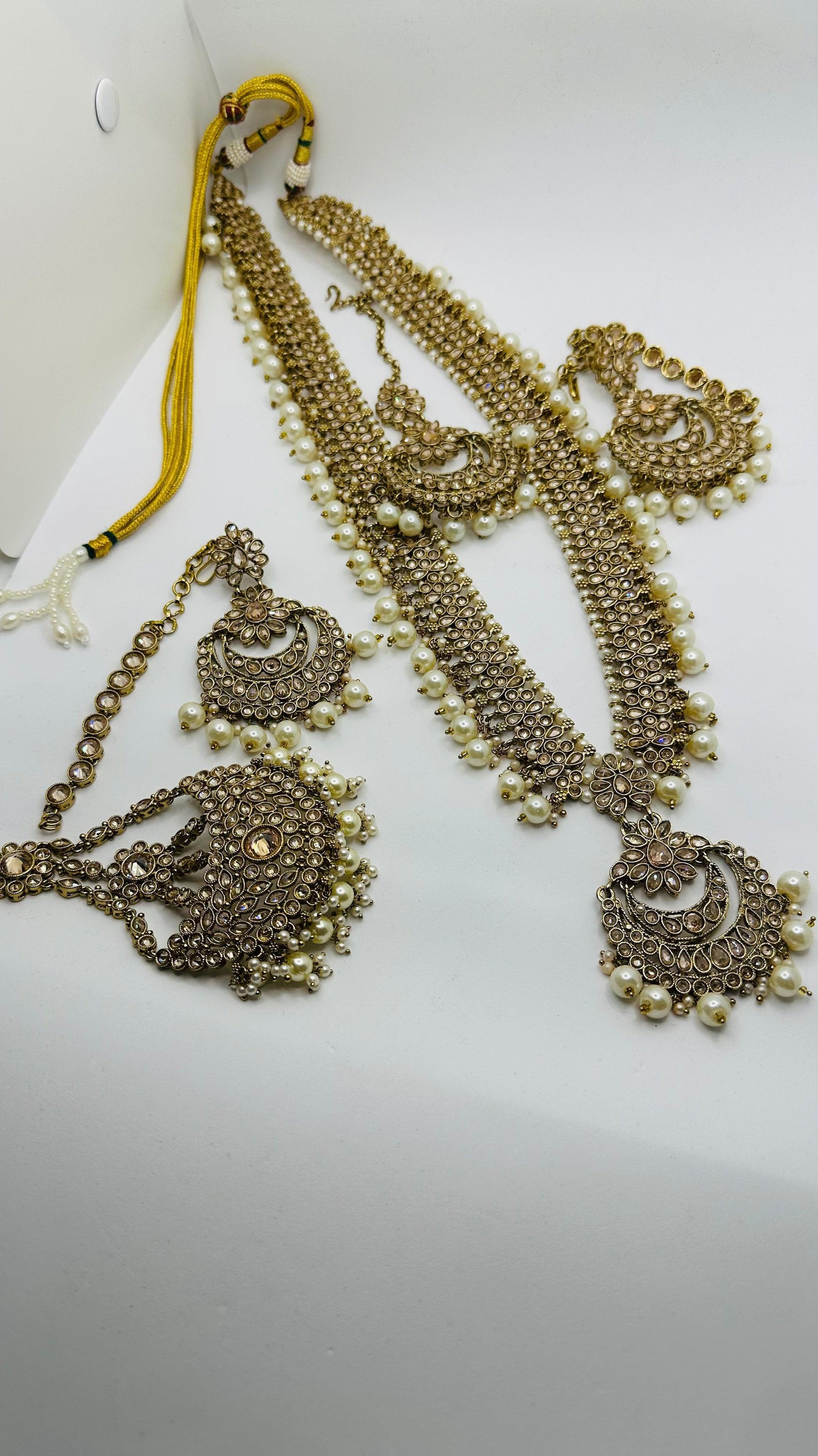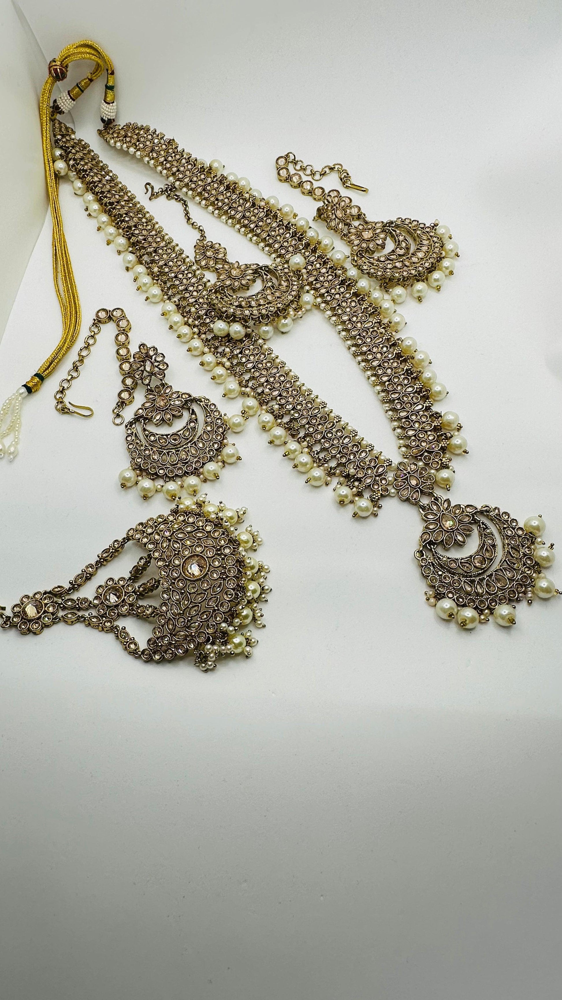Elevate your style with our Beautiful Jewellery Set. This set includes a Kundan polki Pearl long necklace, earrings, maang tikka, and passa, perfect for special occasions. Its intricate designs and stunning details add an elegant touch to your look. Upgrade your jewellery collection with this timeless set.