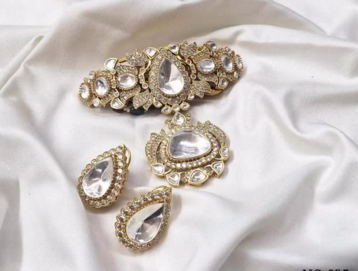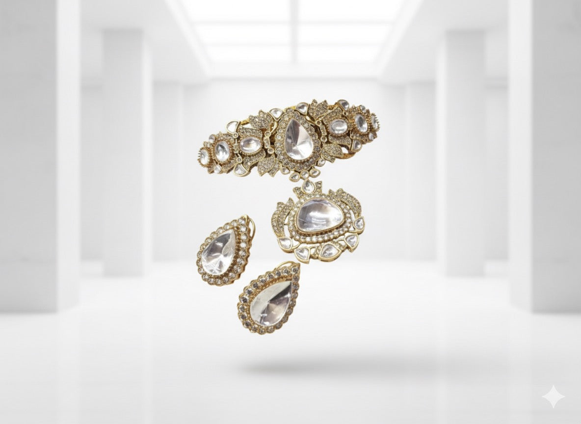 Each piece is meticulously handcrafted by artisans who specialize in Kundan-style jewelry, using luminous doublet stones and moissanite polkis to create a radiant yet refined look.