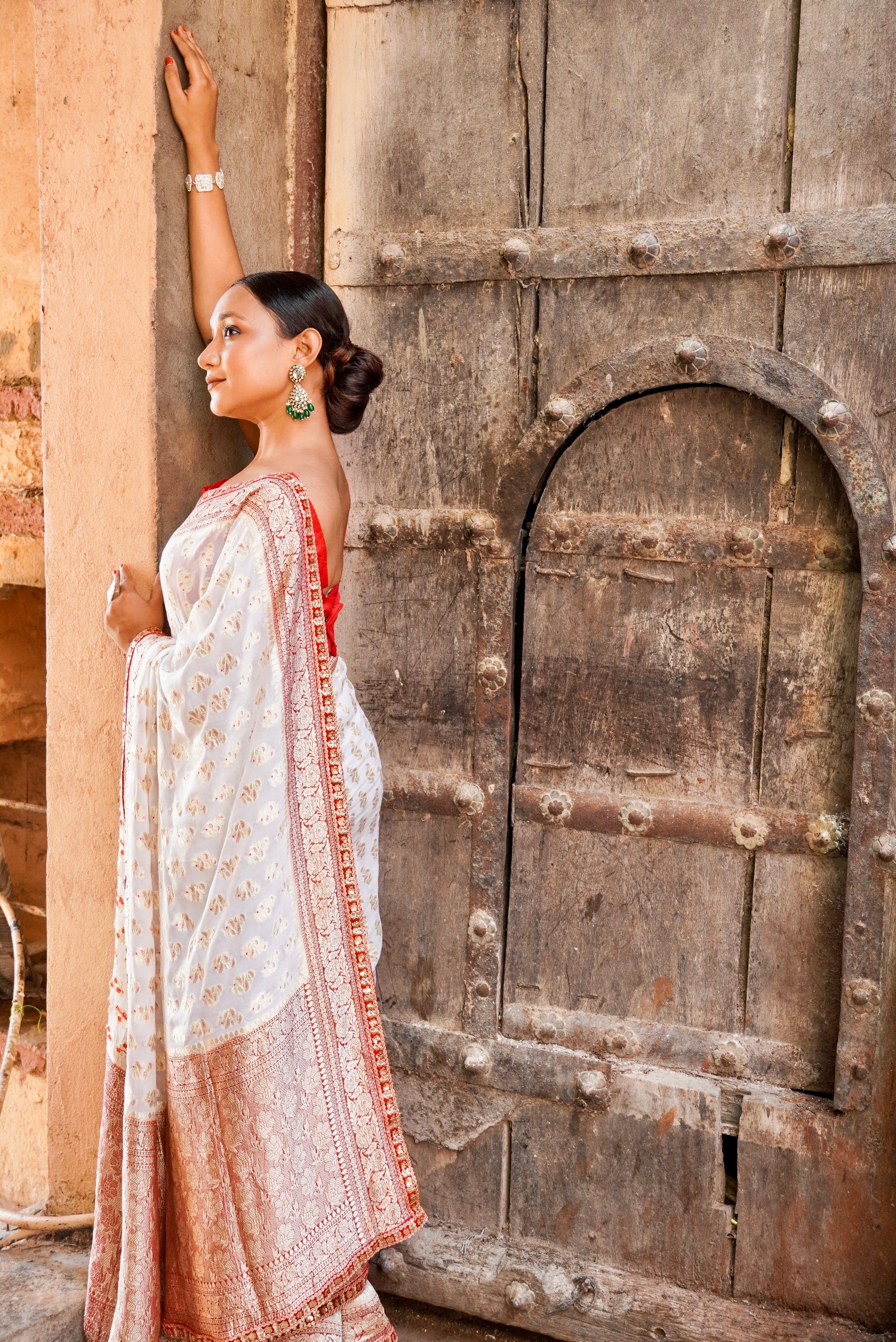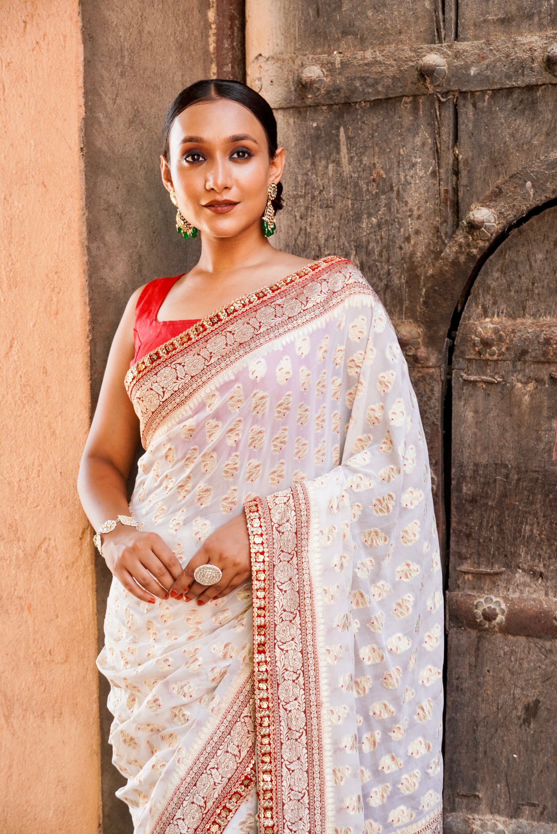 This masterpiece seamlessly blends traditional artistry with contemporary sophistication. Crafted from the finest Khaddi Georgette, the saree drapes effortlessly, creating a graceful and ethereal silhouette. The classic beige and red hue serves as the perfect canvas for the intricate gold zari work, which adds a touch of opulence and glamour.