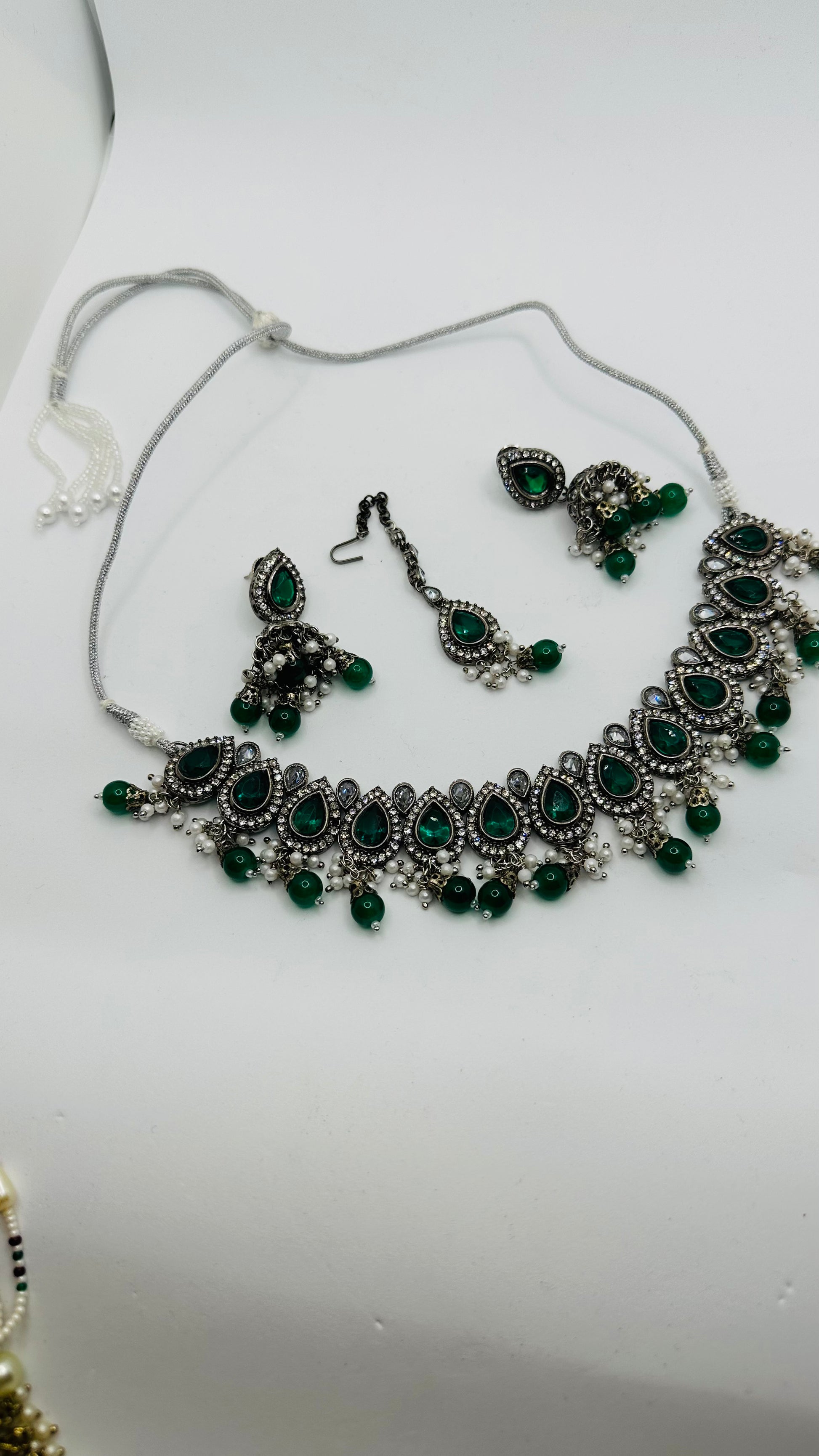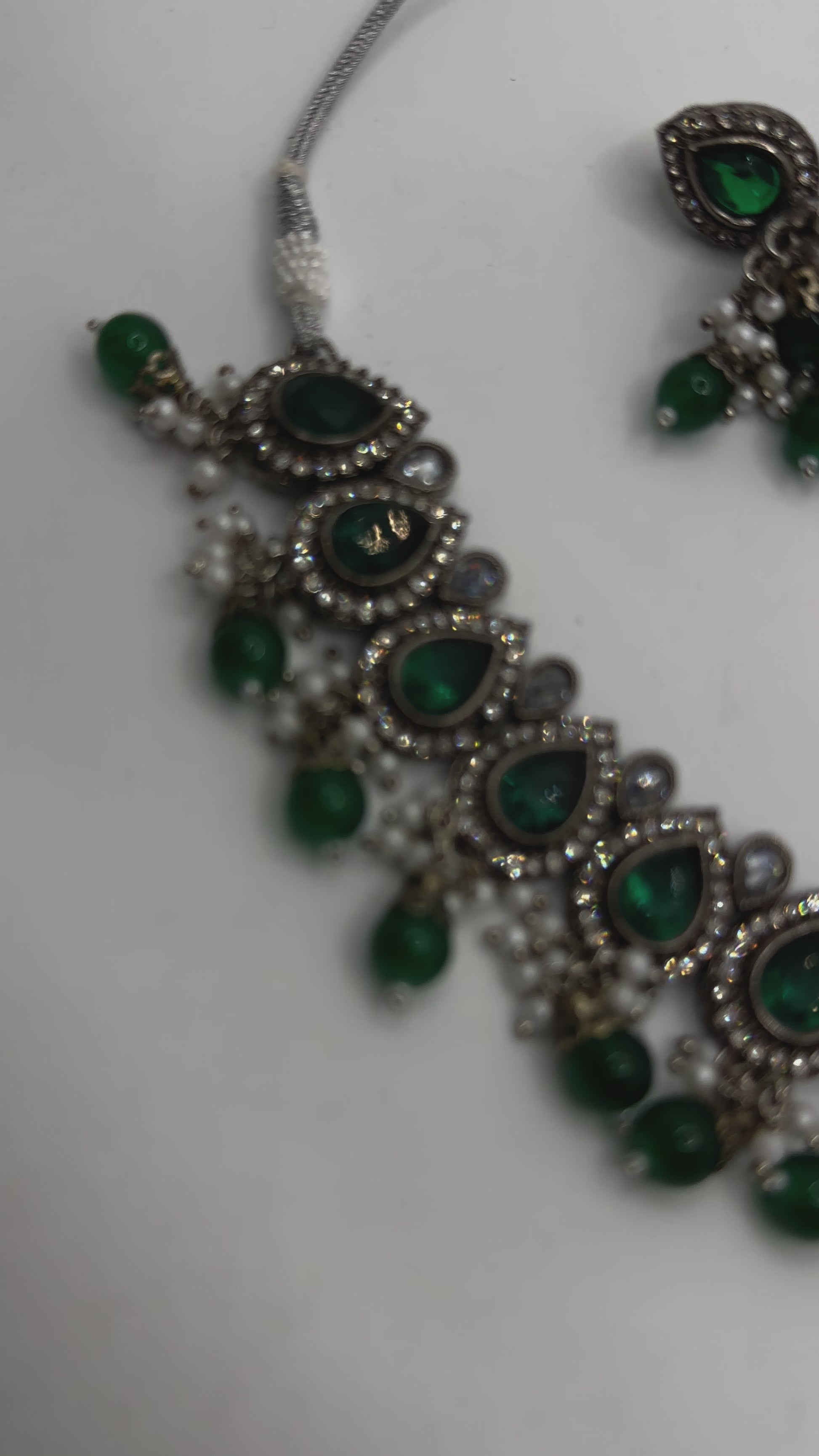 This Emerald Green Polki Kundan Moti Jewelry Set is made with copper-based materials and finished with a silver coating. Adorned with stunning emerald green stones, this set will add an elegant touch to any outfit. Its anti-tarnish properties ensure long-lasting beauty. Perfect for a formal occasion or as a statement piece.
