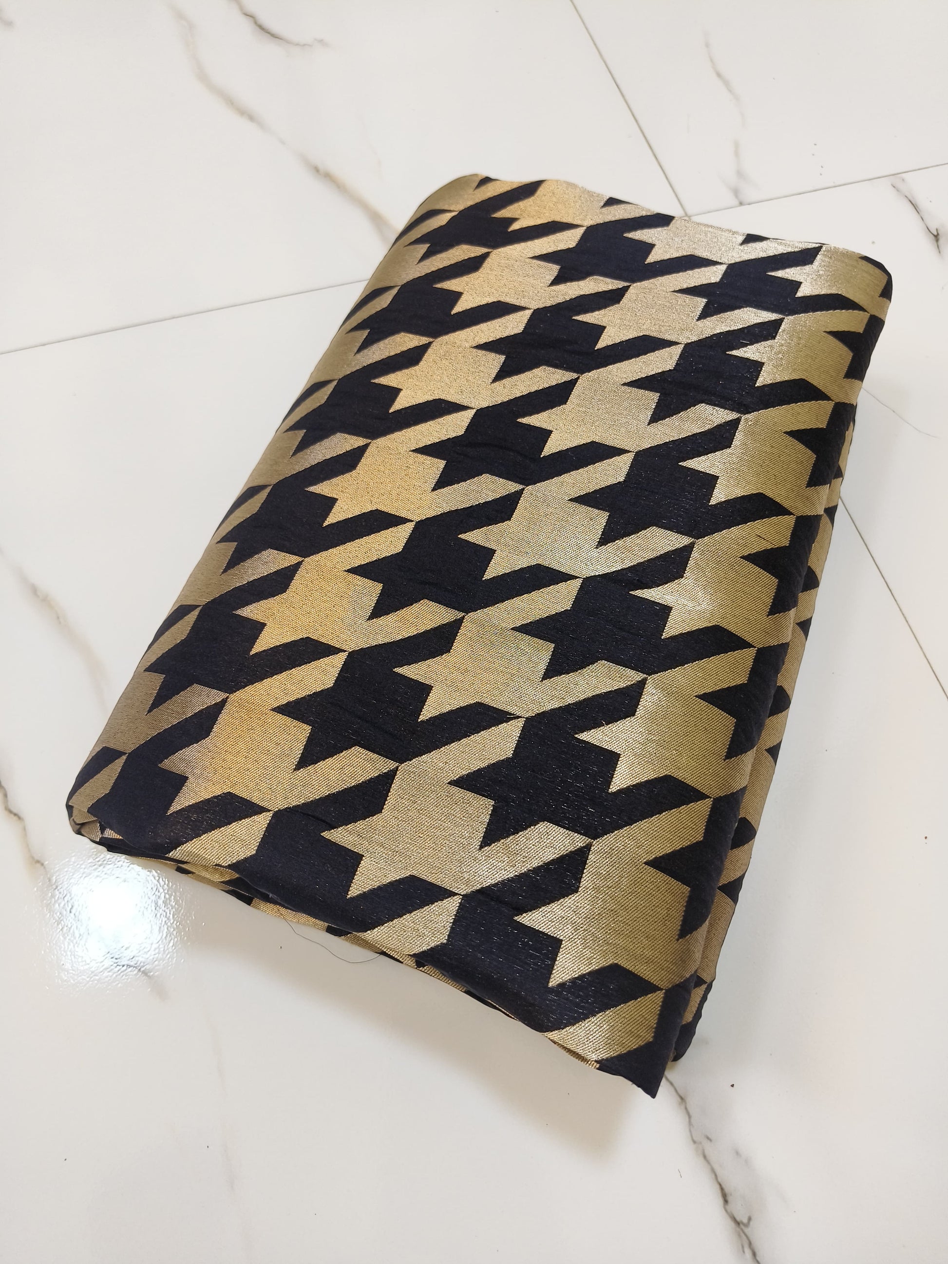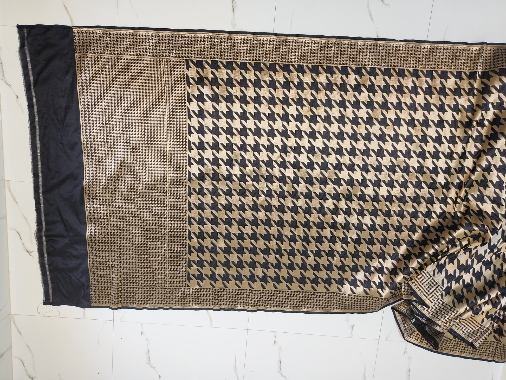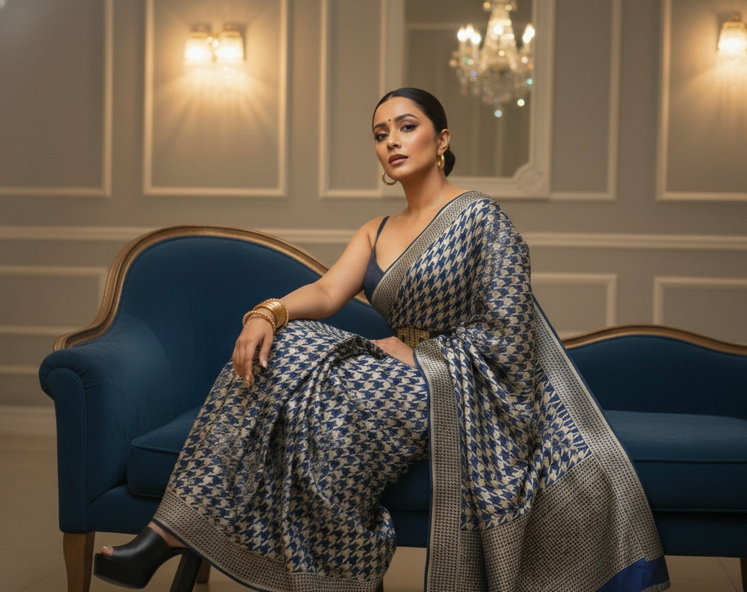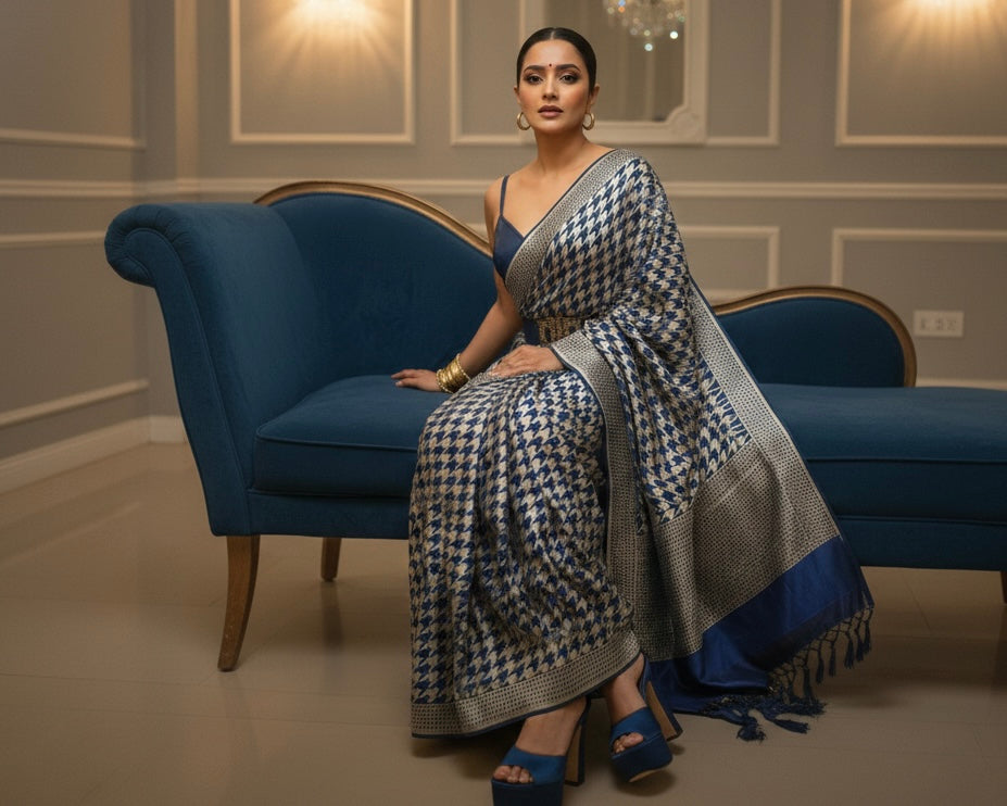 Crafted from pure handwoven Mulberry Katan silk, this saree features a bold geometric matrix weave that creates depth, dimension, and undeniable presence.