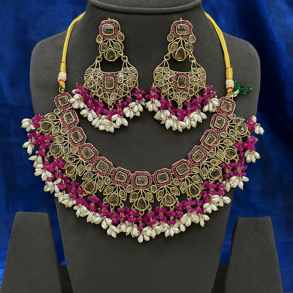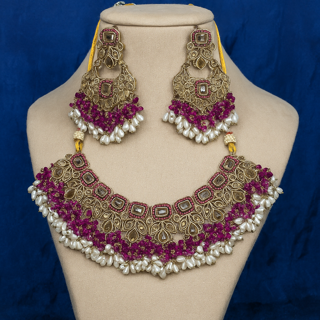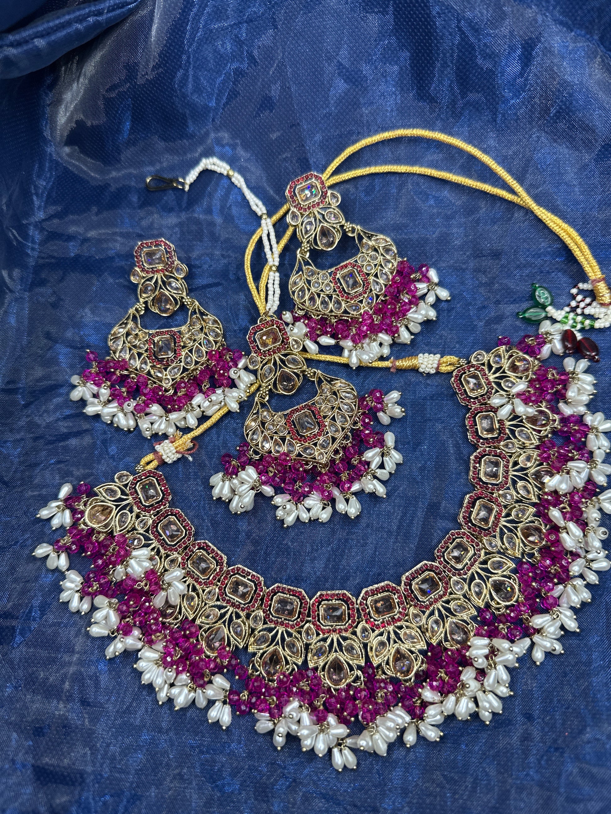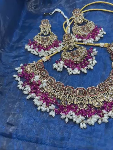 Beautiful brass based Polki Kundan and Moti Jwellery set . Comes with maang tikka , earrings and a choker necklace. The set is finished beautifully with motis.