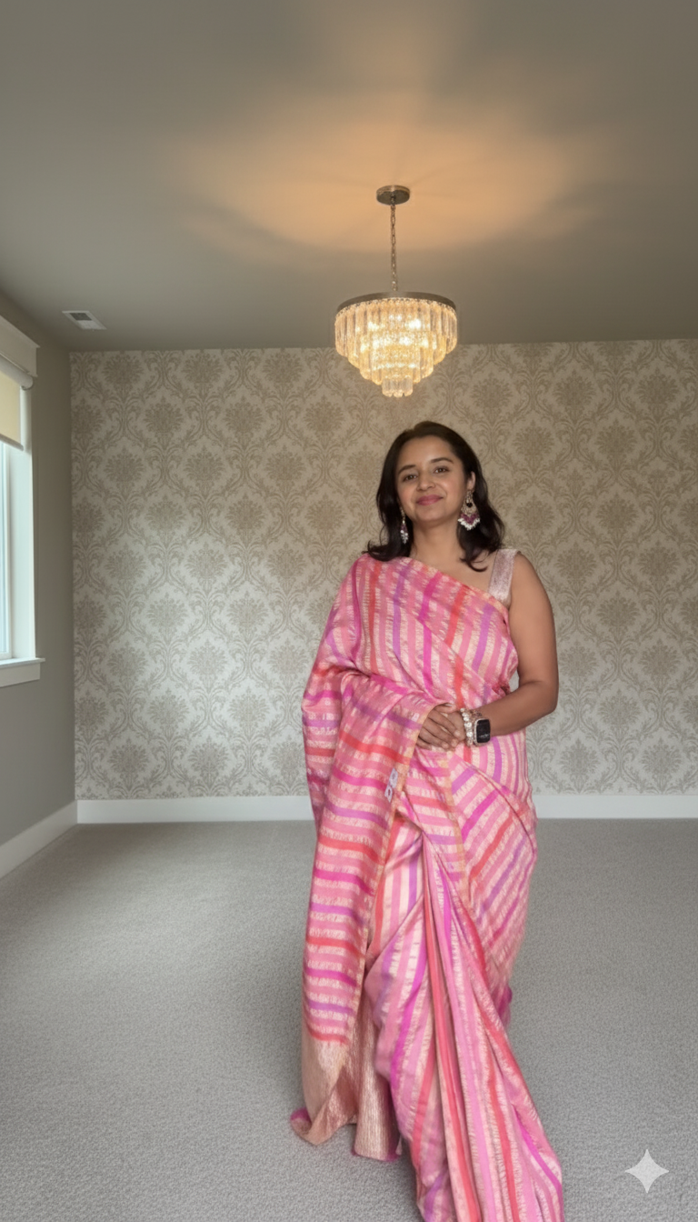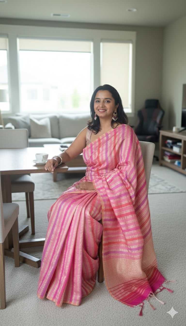 Pink–peach palette with alternating gold/silver zari lines