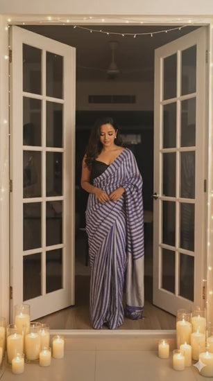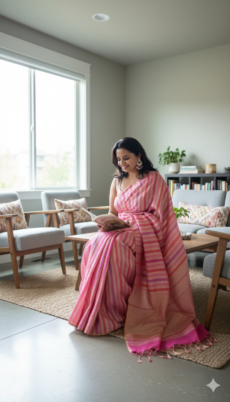 From our Nazm collection, this saree feels like a quiet stanza—soft, luminous, and impossibly fluid. The crushed texture keeps it feather-light while pink and peach melt into each other, traced by alternating zari lines that catch light like a whisper. Dress it up for soirées or keep it minimal for intimate celebrations—the drape moves like poetry.