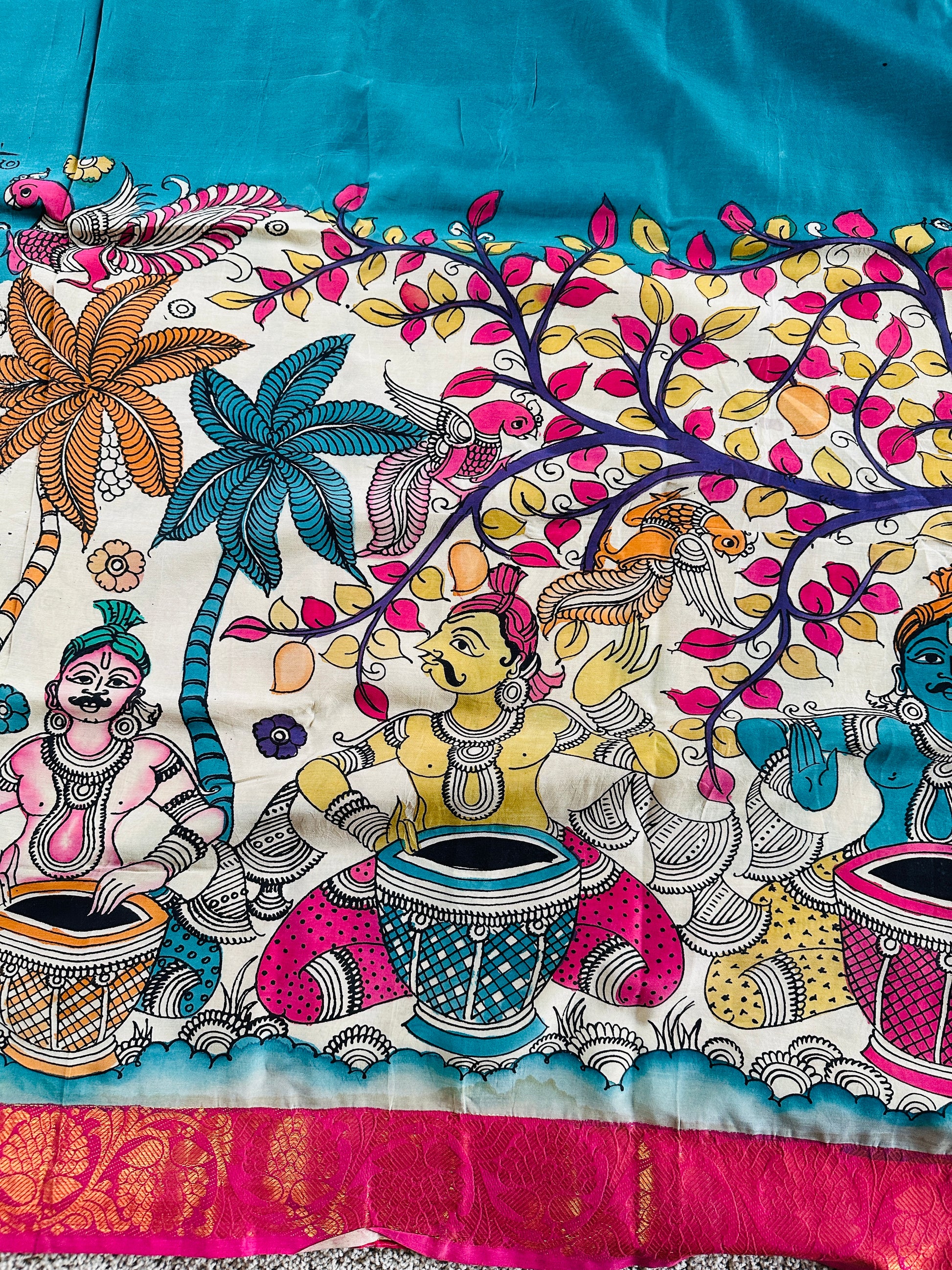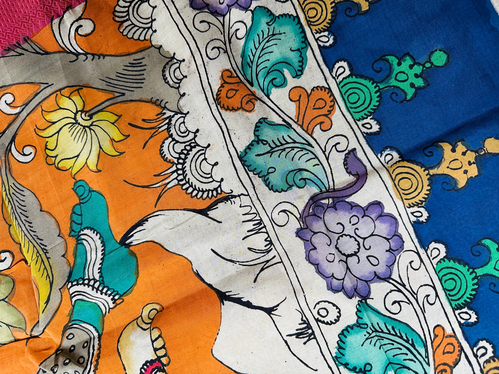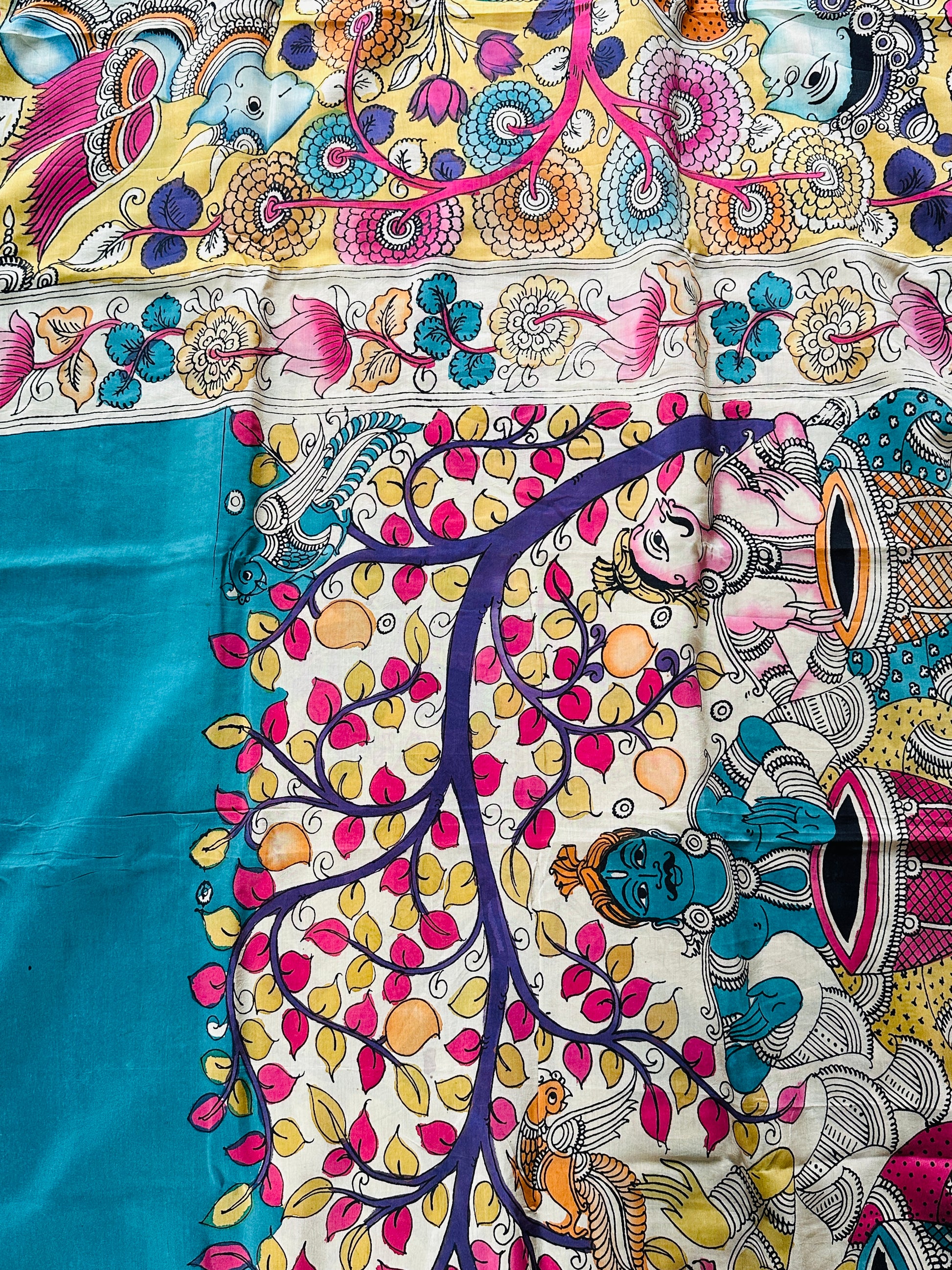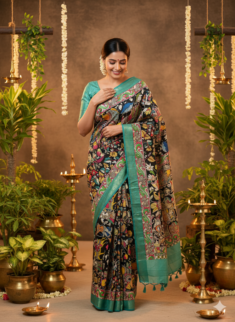 Beautiful pure Hand pen Kalamkari saree in Pure Silk Just by looking at the saree it takes you down through the beautiful elements this saree offers..