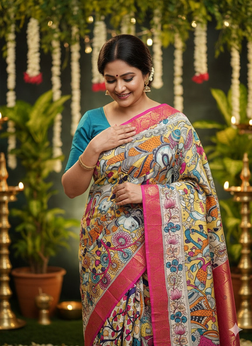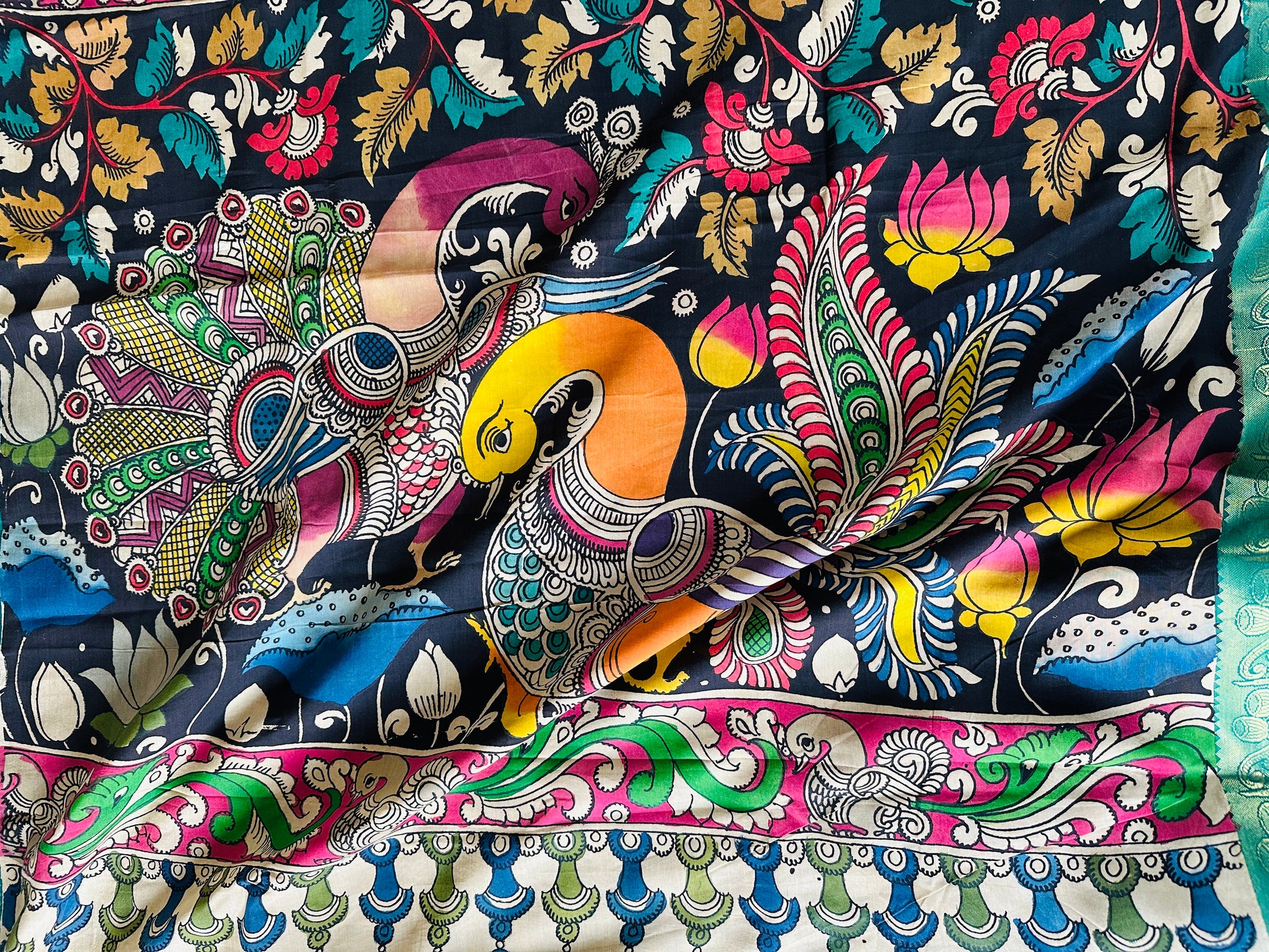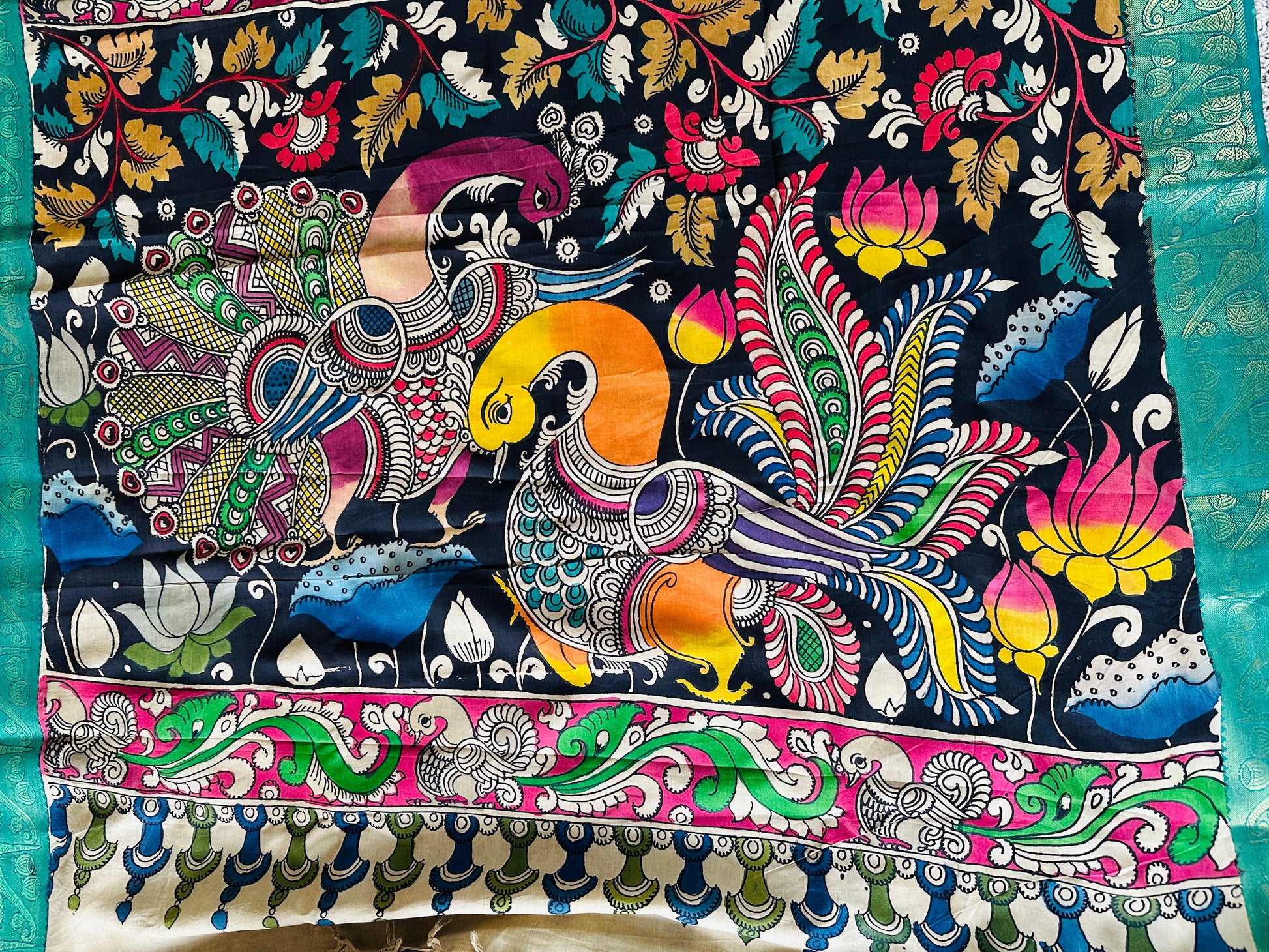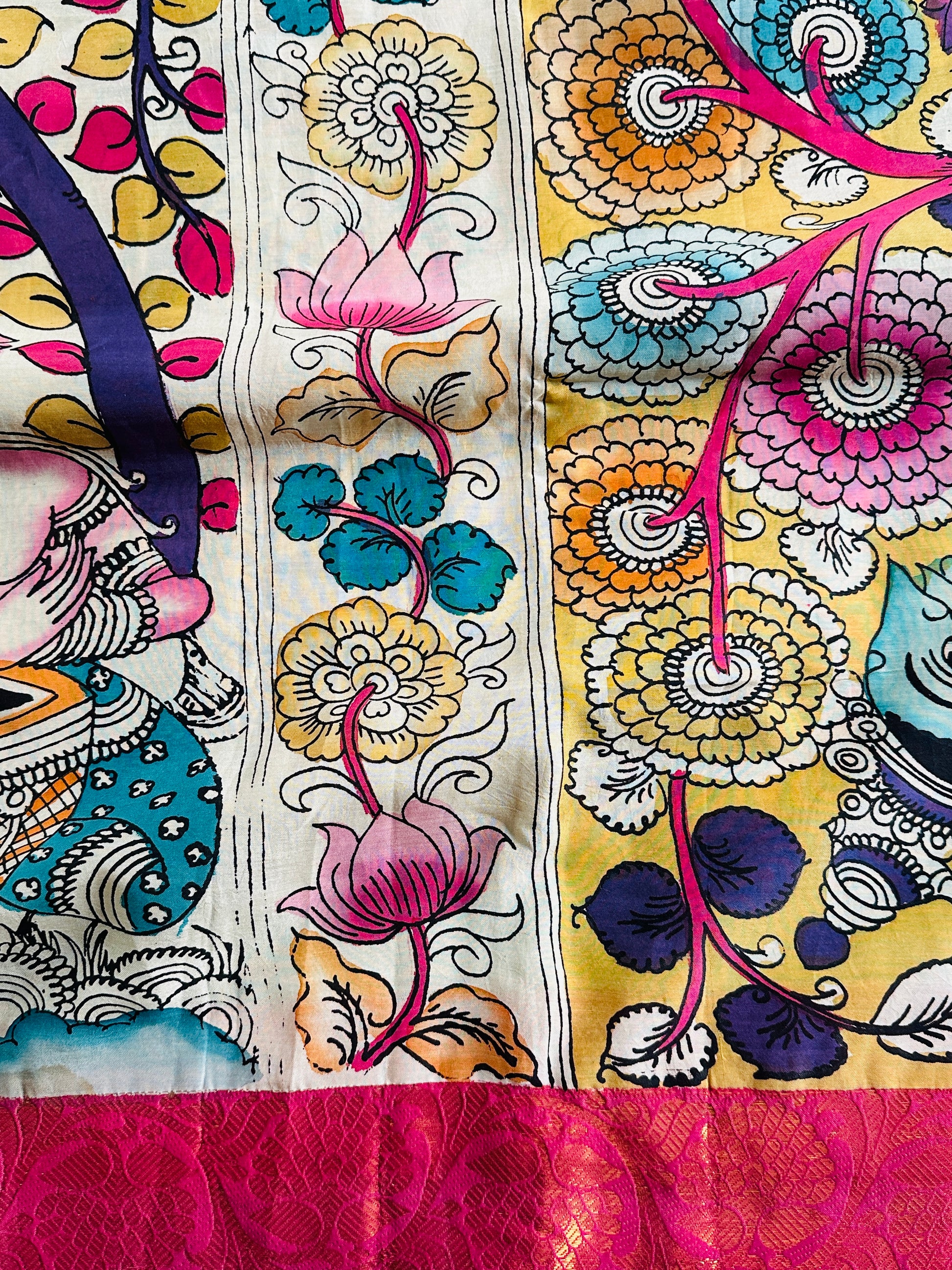 Pen Kalamkari with zari border in Silk - with silk Mark
