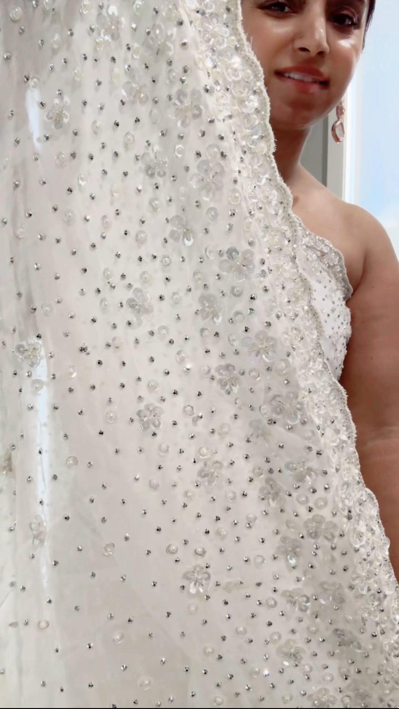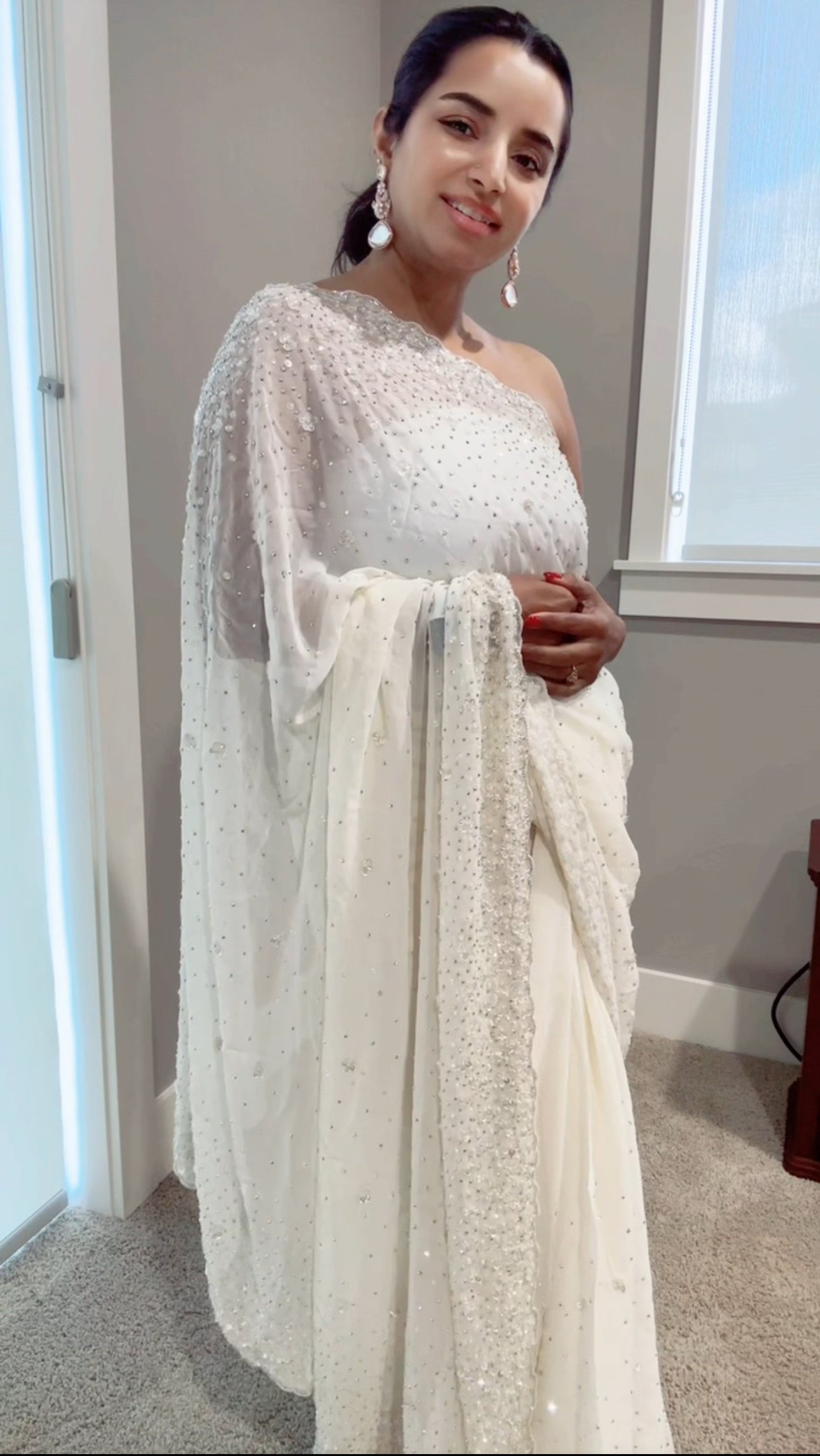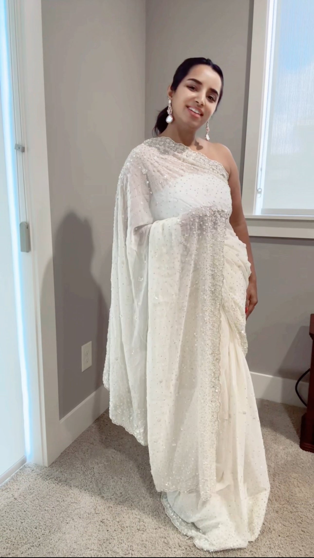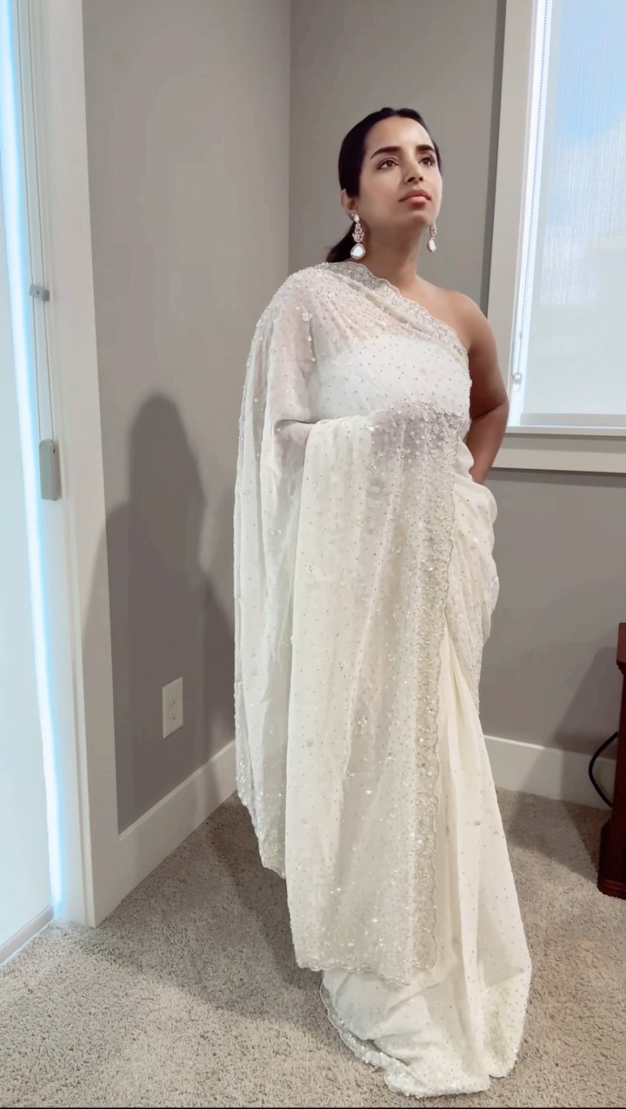 All over sequence , moti , cut Dana and stone work on my ire Georgette is just wow. So soft , shimmery and beautiful. Drapes like a dream and makes you a stunner. This is an exclusive piece with embellishments all over and on the blouse fabric as well. Just wow like a dream ....