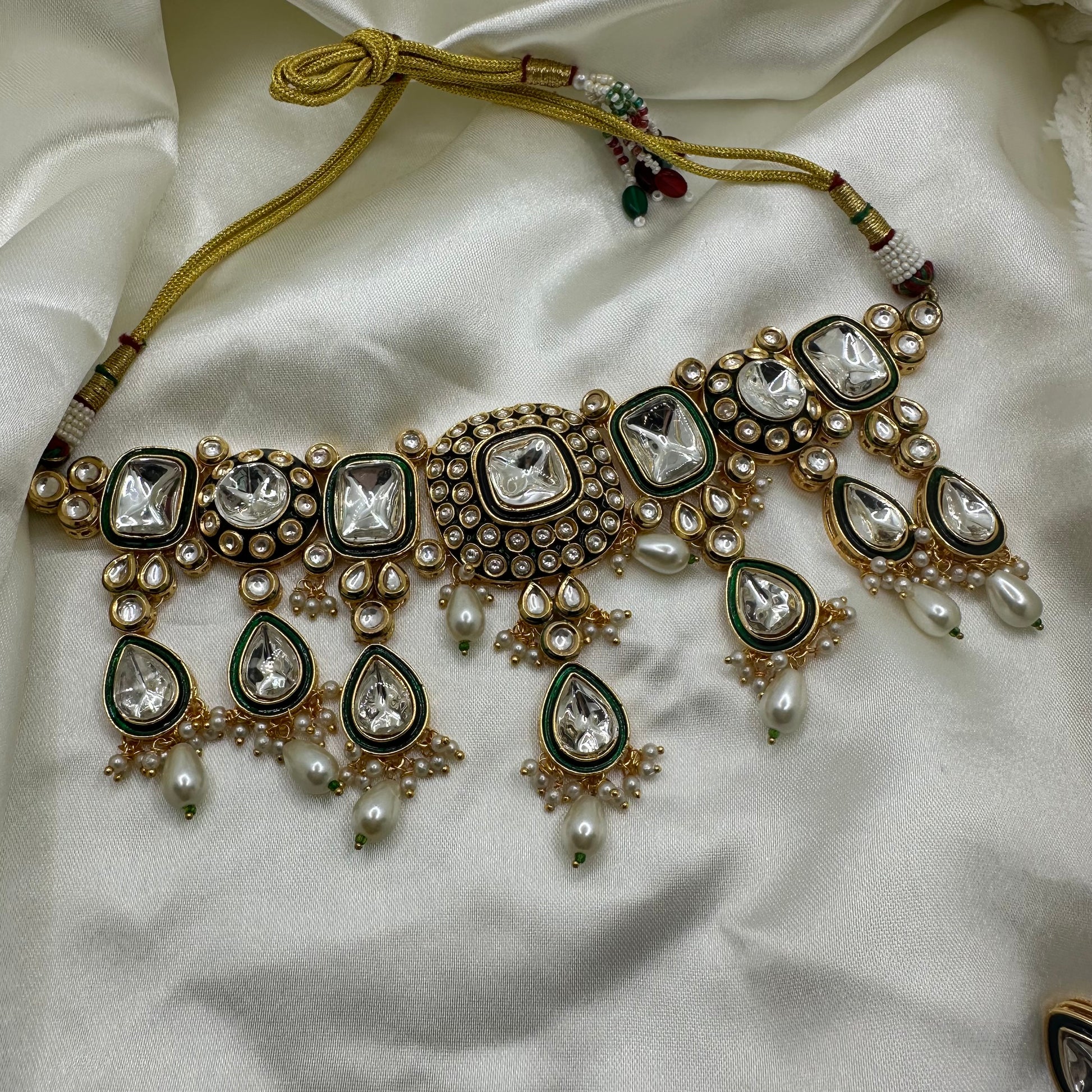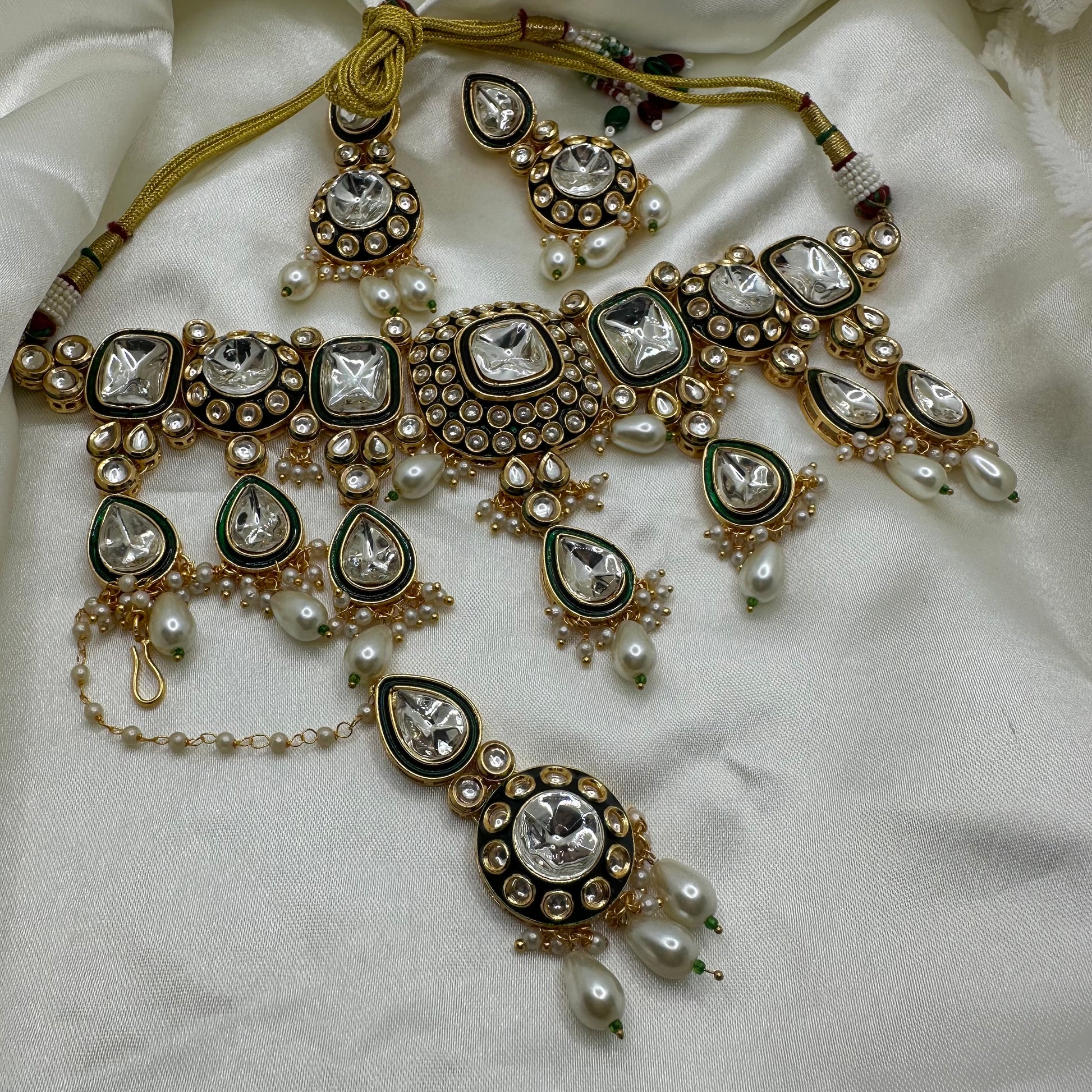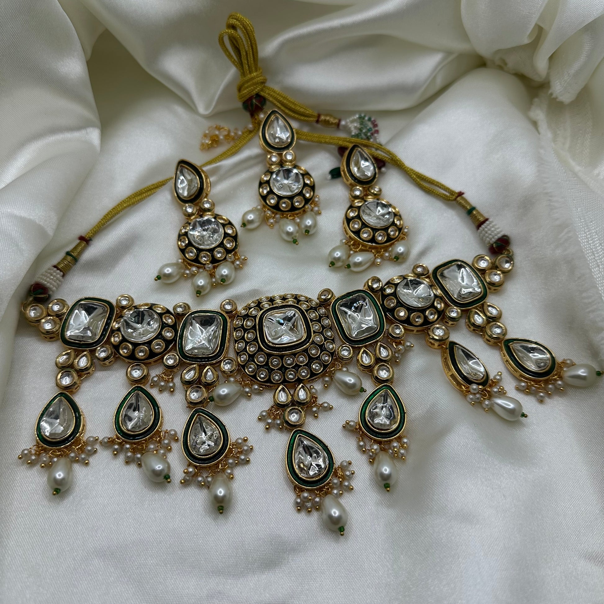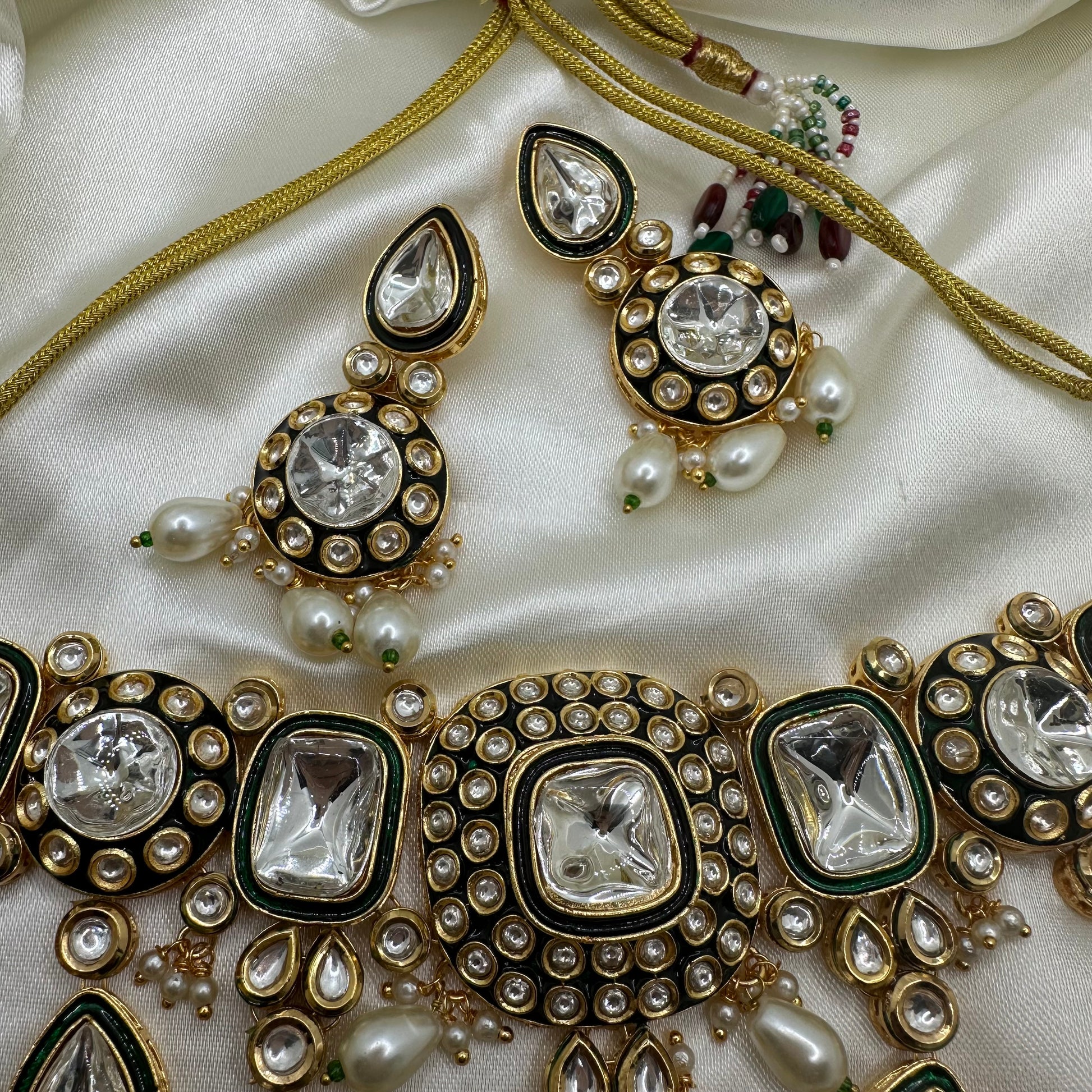 This Gorgeous Polki & Uncut Kundan Moti Jewelry Set is made with copper-based materials and finished with a silver coating. Adorned with stunning polki stones, this set will add an elegant touch to any outfit. Its anti-tarnish properties ensure long-lasting beauty. Perfect for a formal occasion or as a statement piece.