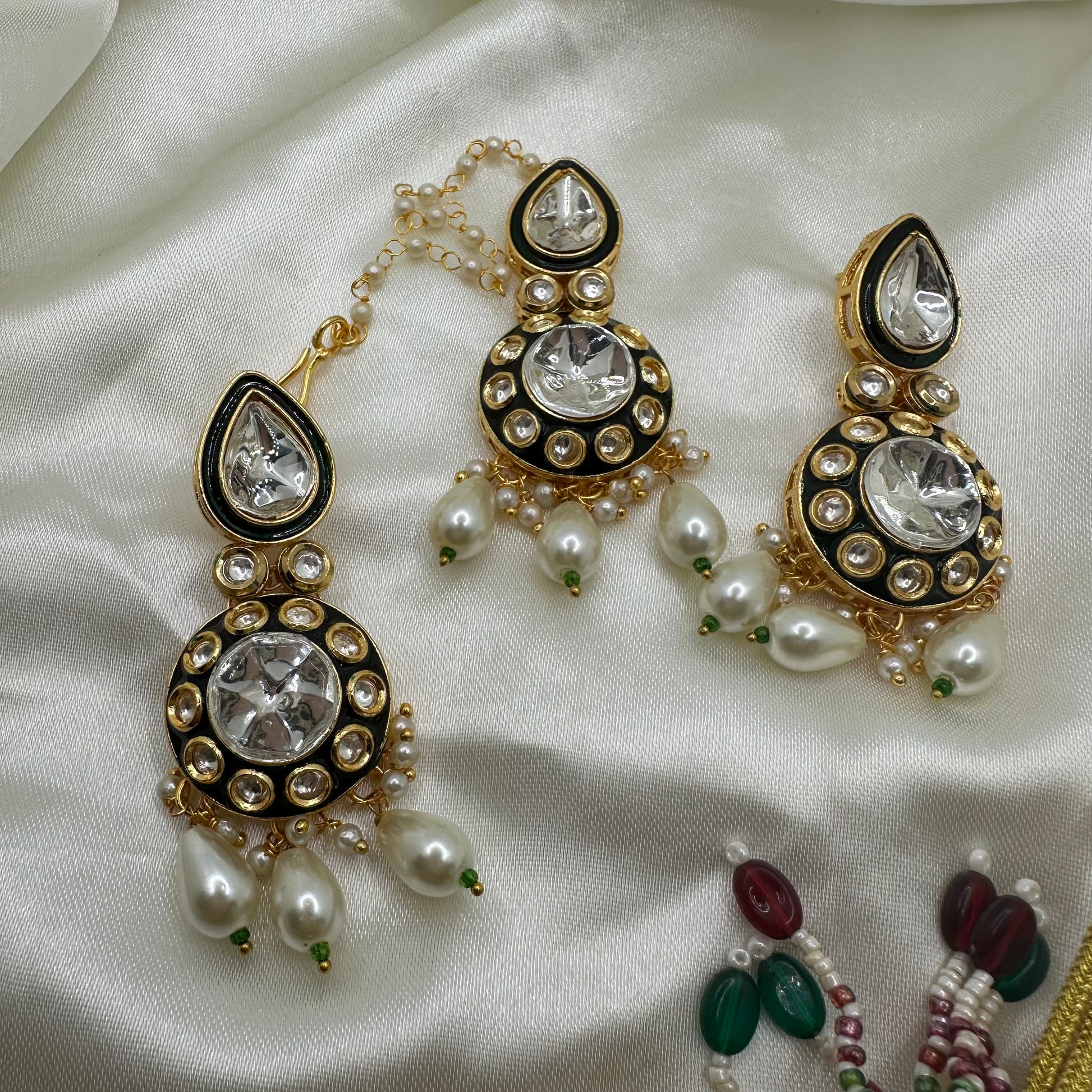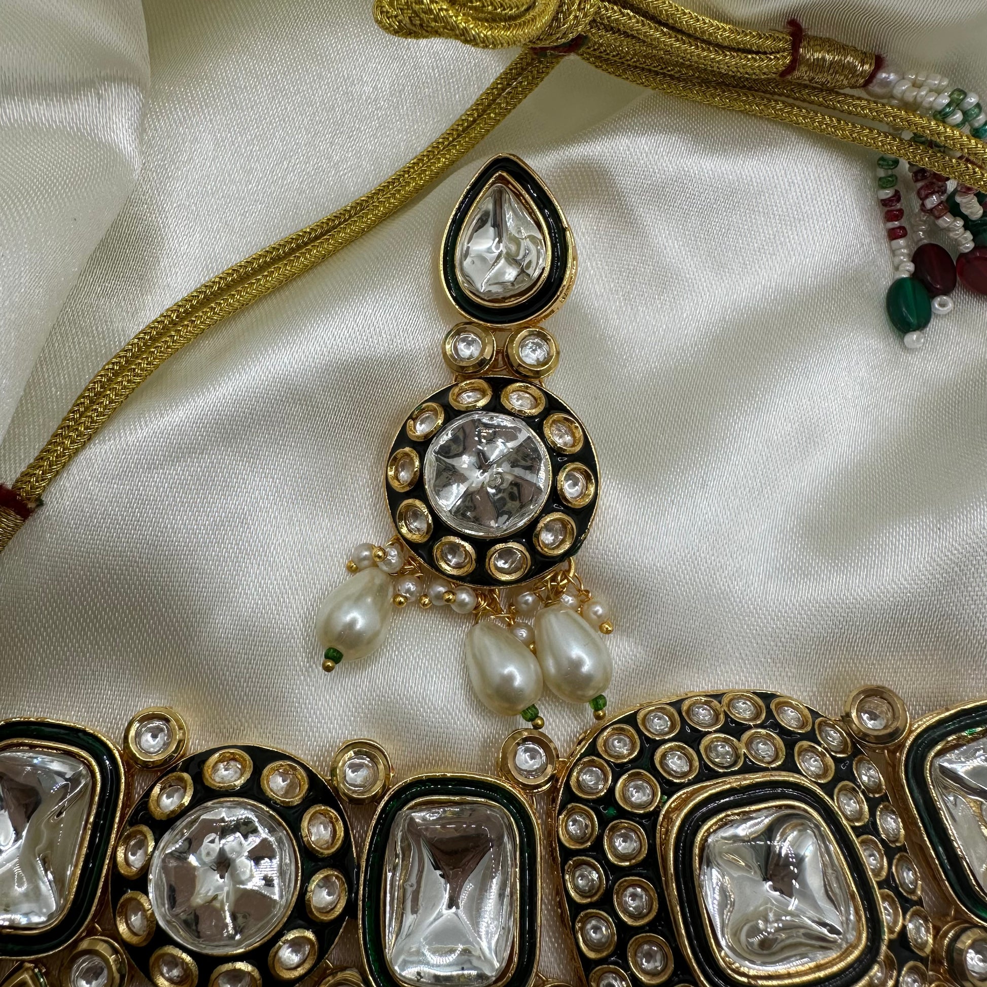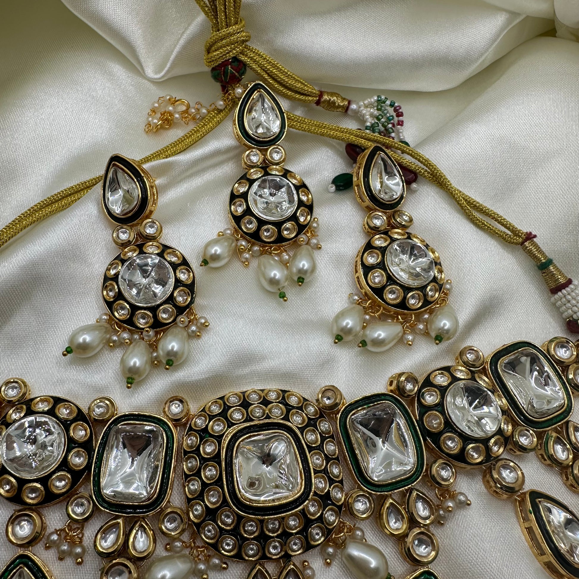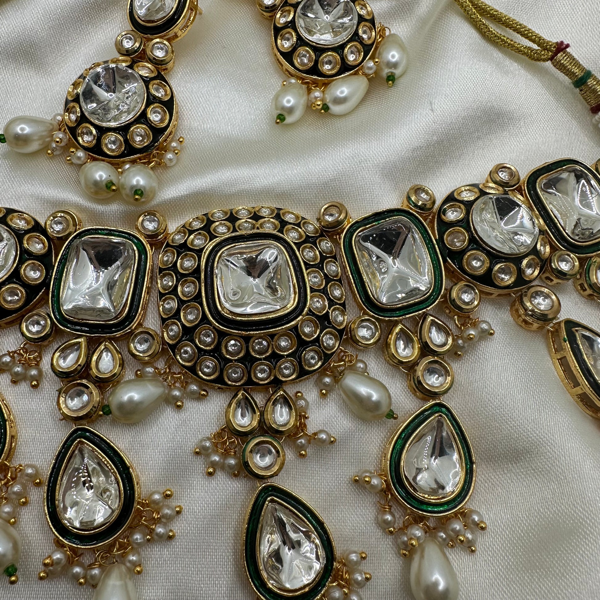 This Gorgeous Polki & Uncut Kundan Moti Jewelry Set is made with copper-based materials and finished with a silver coating. Adorned with stunning polki stones, this set will add an elegant touch to any outfit. Its anti-tarnish properties ensure long-lasting beauty. Perfect for a formal occasion or as a statement piece.