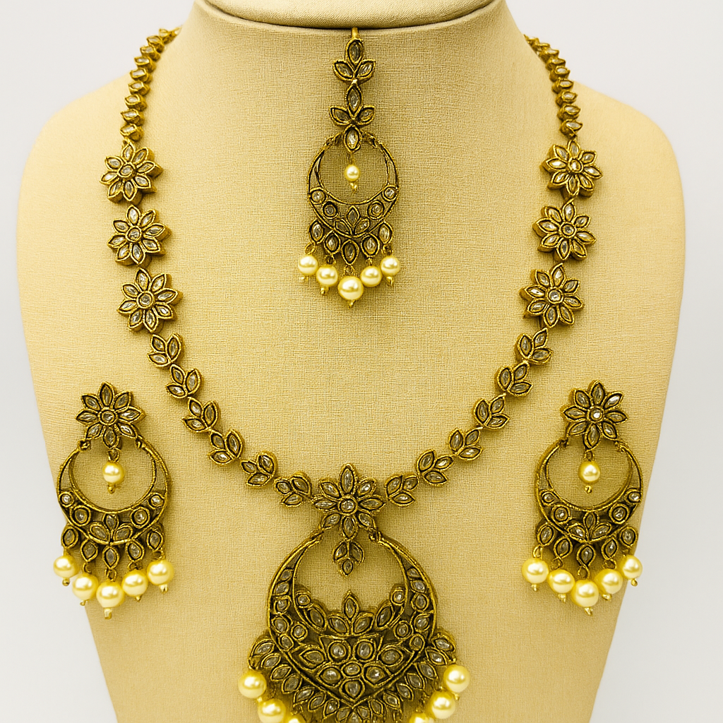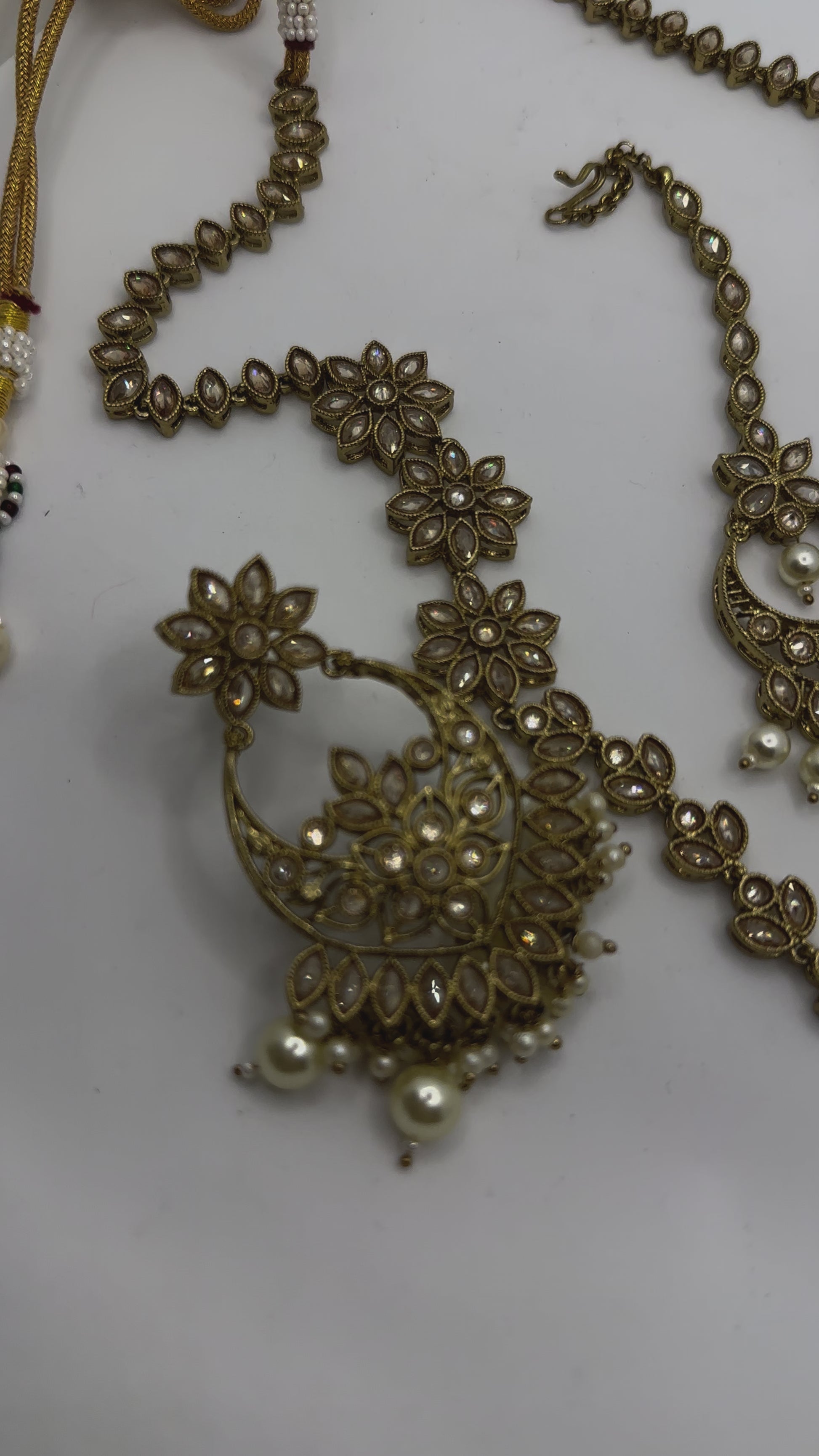Beautiful brass based Polki Kundan and Moti Jwellery set . Comes with maang tikka , earrings and a necklace. The set is finished beautifully at the back with meenakari...