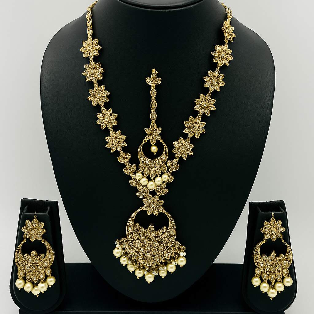 This stunning long necklace set features lavish Polki kundan adornments, adding an elegant touch to any outfit. Crafted with expert precision, this luxurious set is sure to elevate your style and make a statement for any occasion. Comes with necklace , earrings and maang tikka.