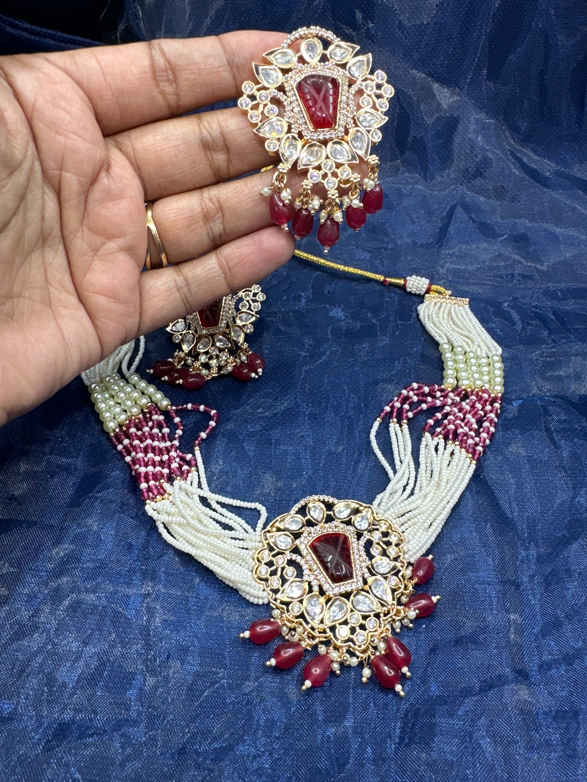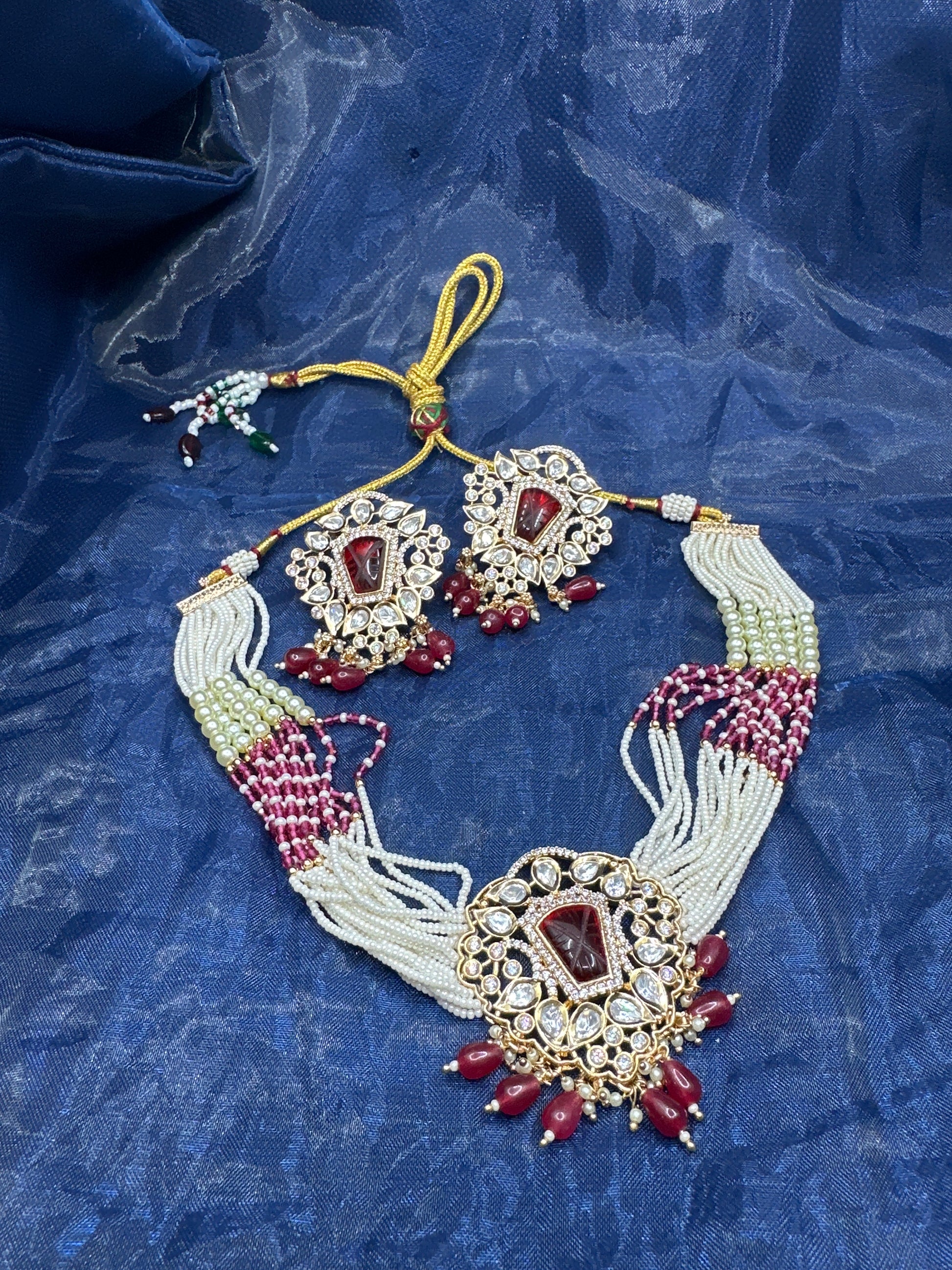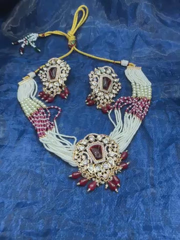 Beautiful brass based Polki Kundan and Moti Jwellery set . Comes with earrings and a choker necklace. The set is finished beautifully with motis.